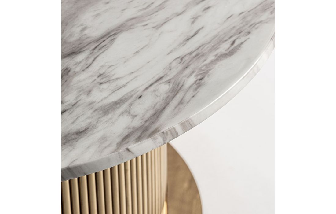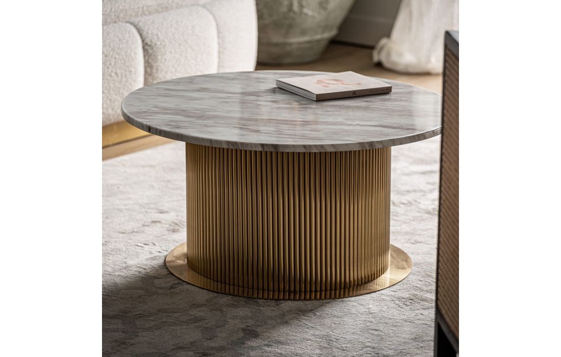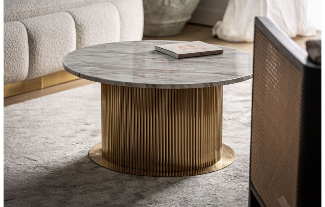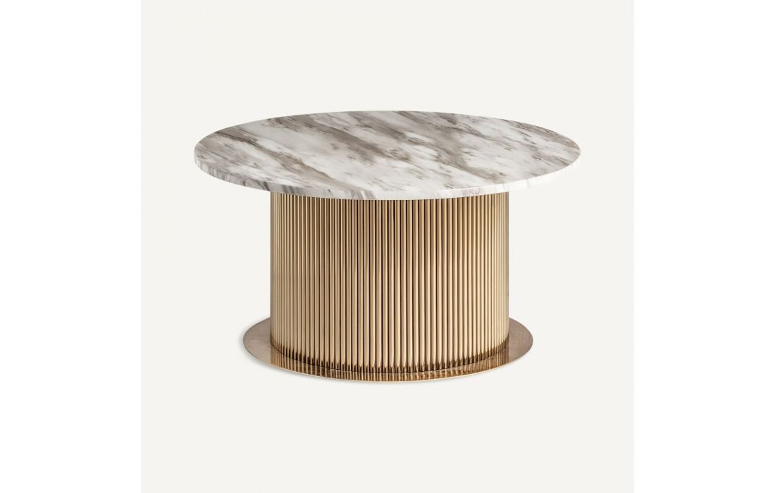 Mesa de centro com estrutura em aço dourado e tampo em mármore sintético.Destinatário :