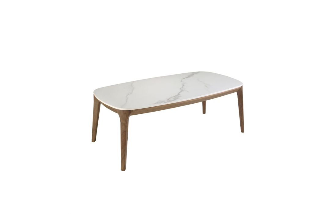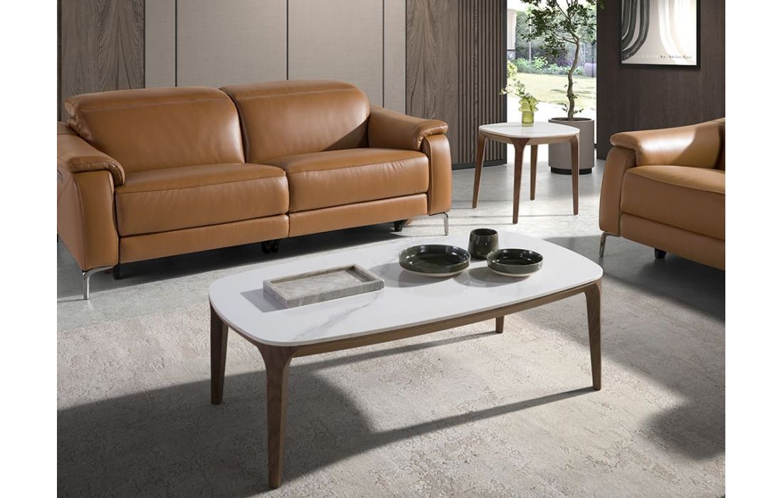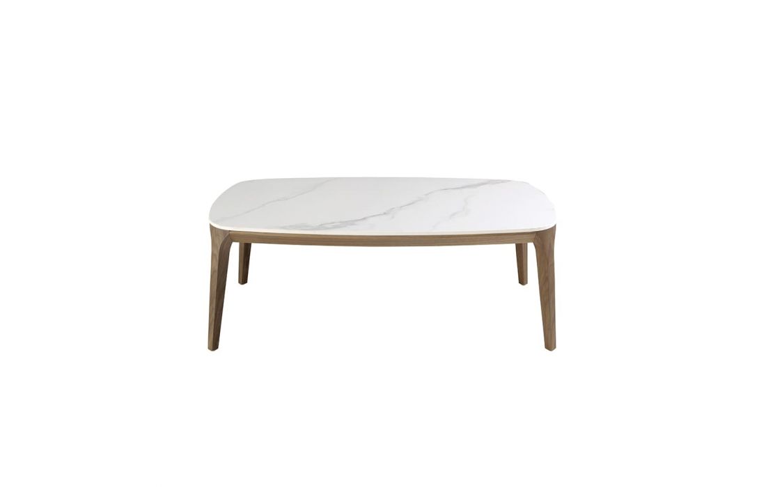 Mesa de centro moderna com acabamento brilhante em mármore e pernas em MDF de nogueiraDestinatário :