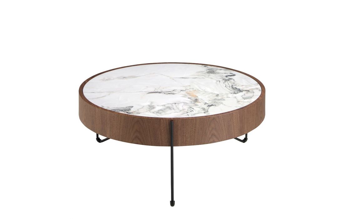Mesa de centro moderna feita de MDF de nogueira e um elegante tampo de mármore em acabamento brilhante e sua estrutura de pernas em aço inoxidávelDestinatário :