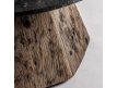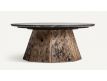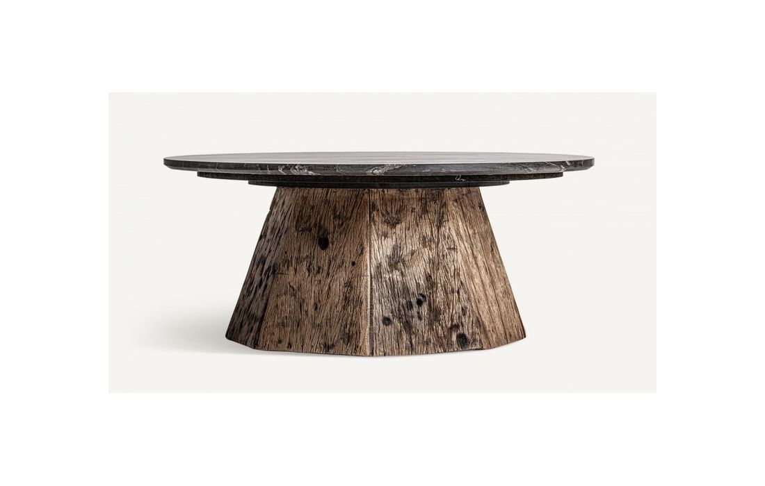 Mesa de centro em mármore na cor castanho combinada com madeira recuperada