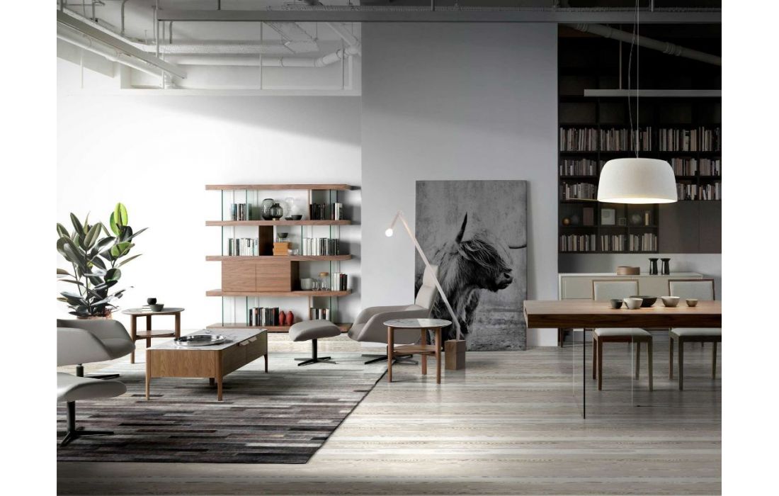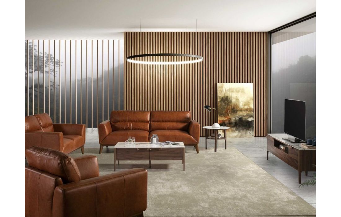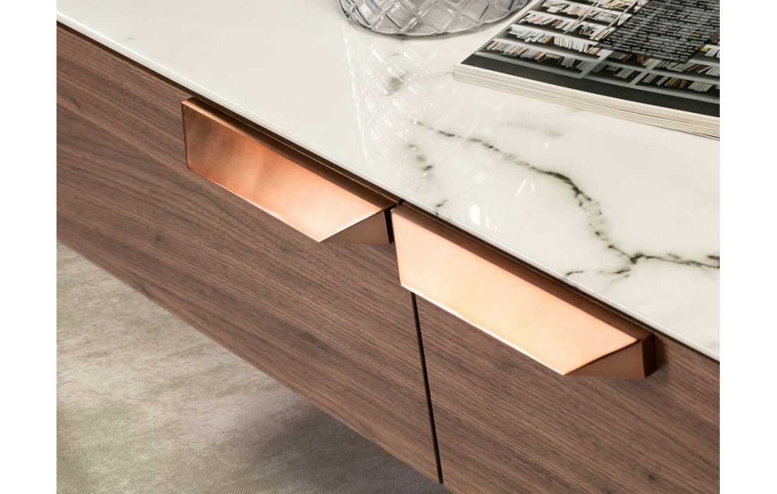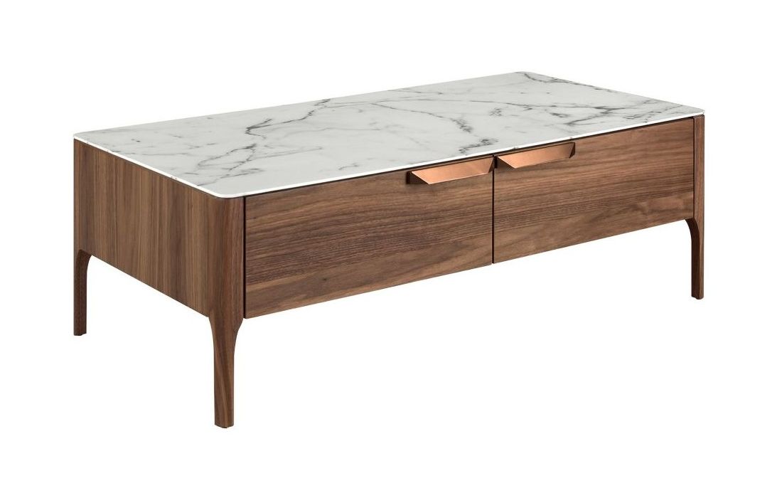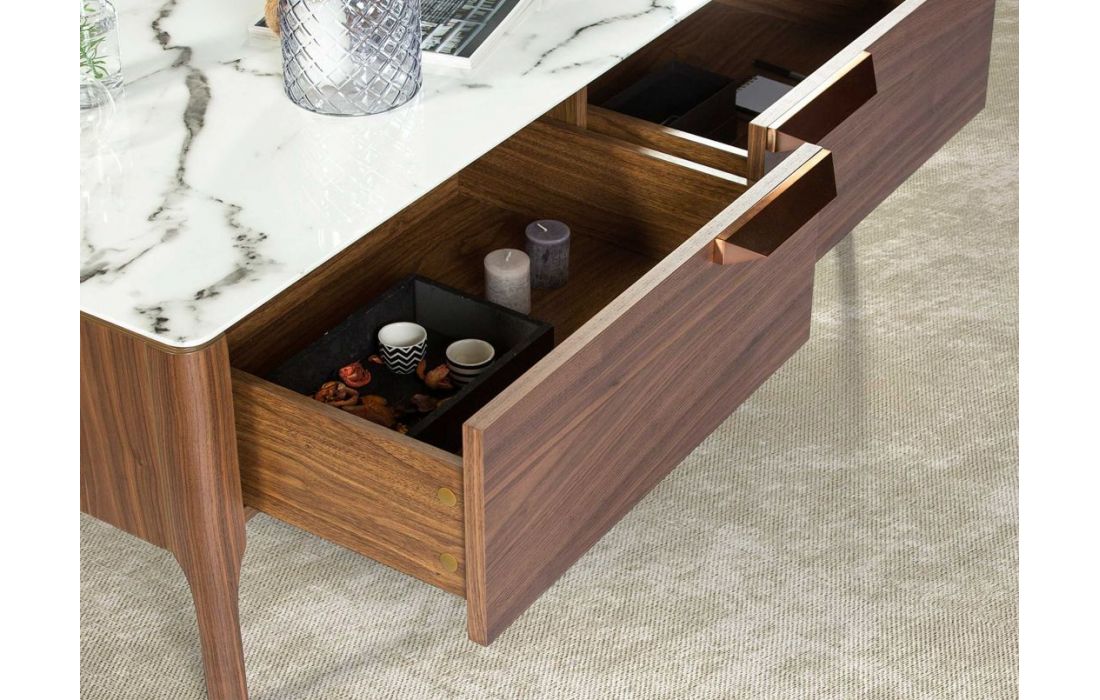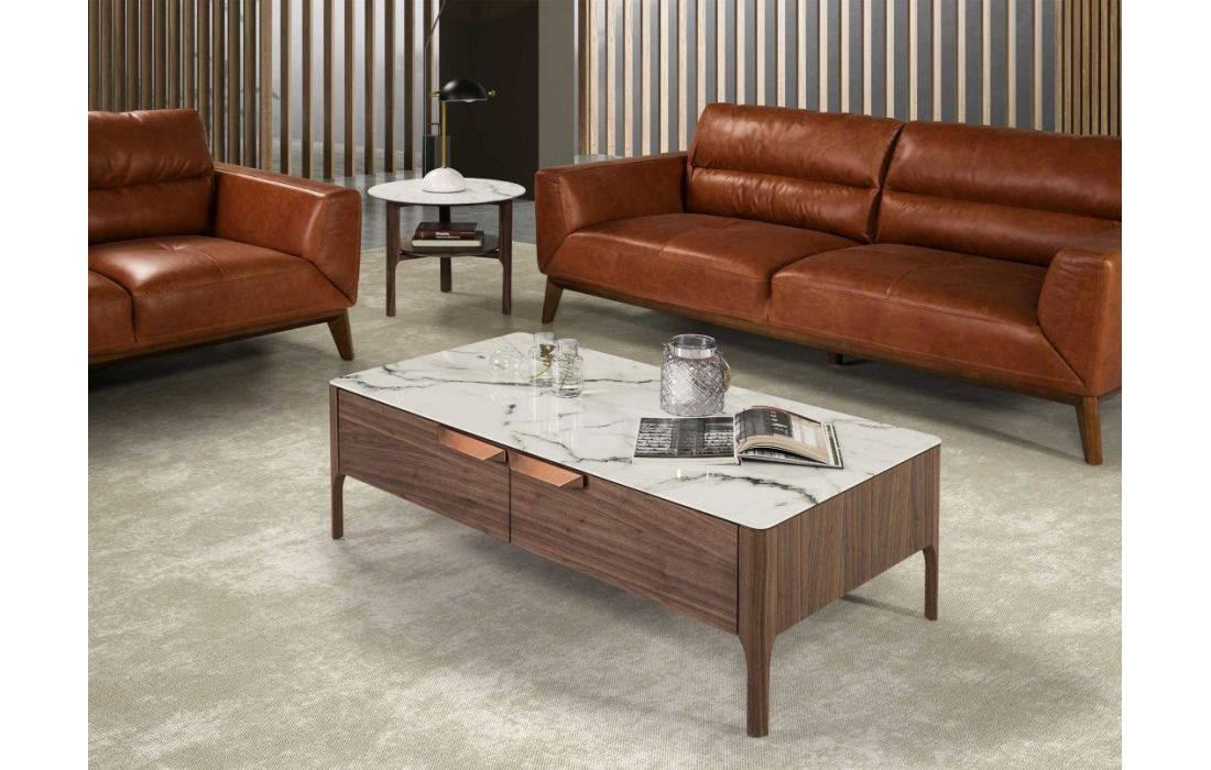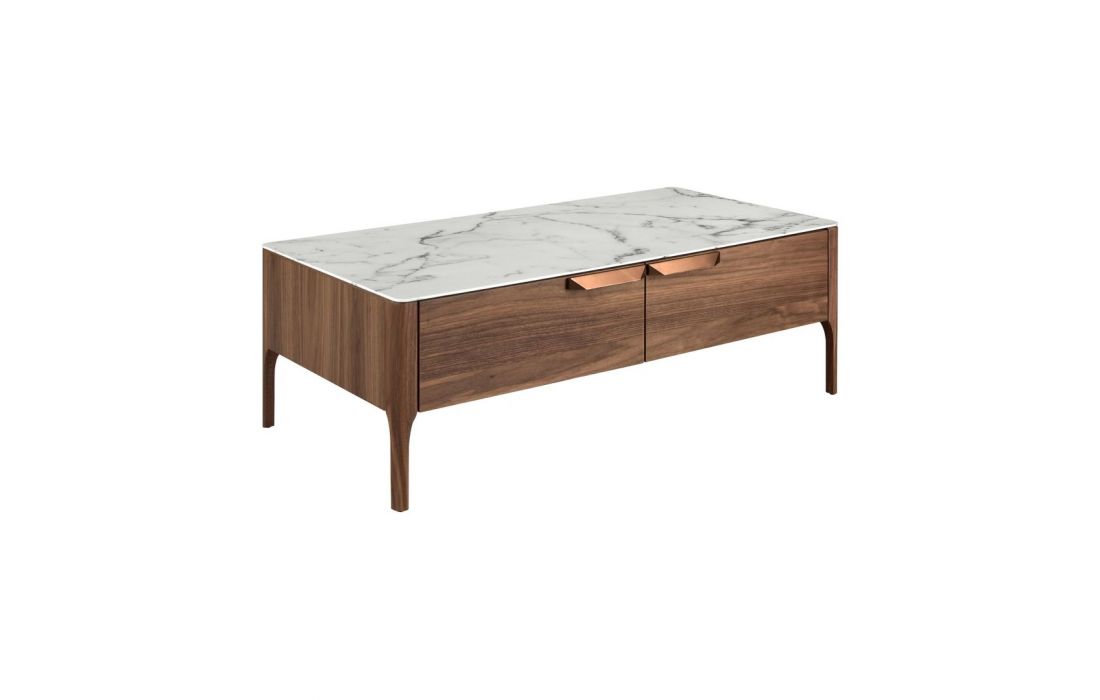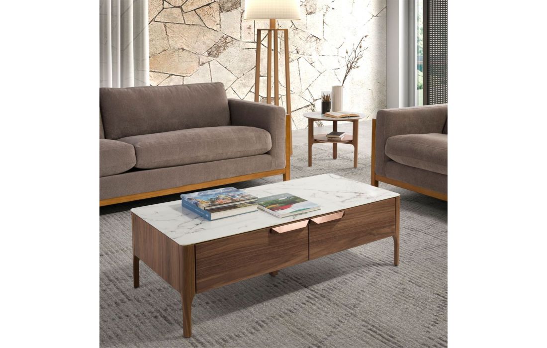 Mesa de centro retangular com design moderno, feita em MDF de nogueira natural e um elegante tampo de vidro com efeito mármore em porcelana, com 2 gavetasDestinatário :