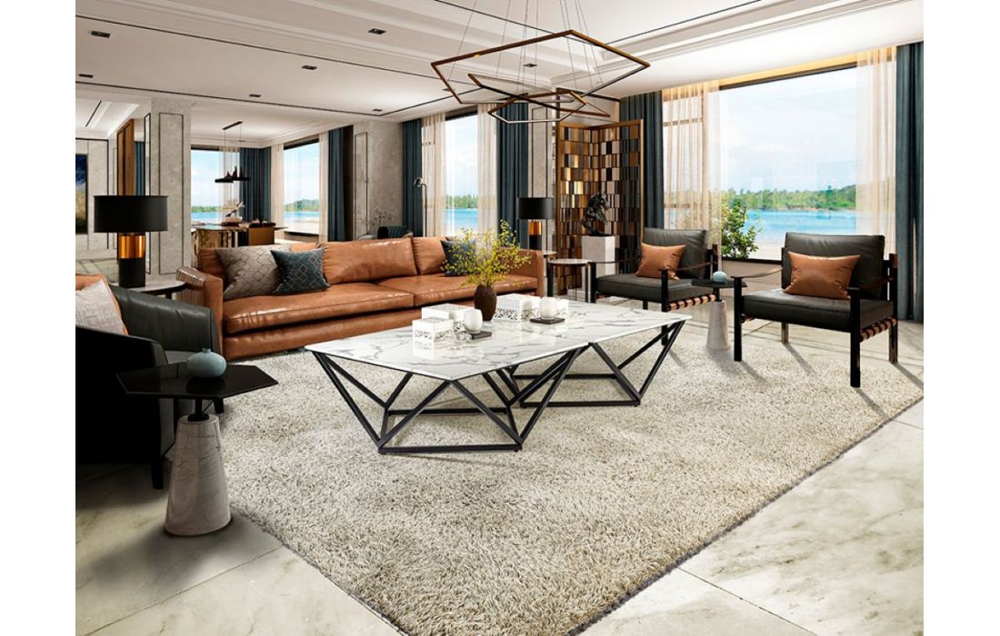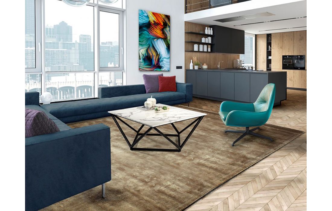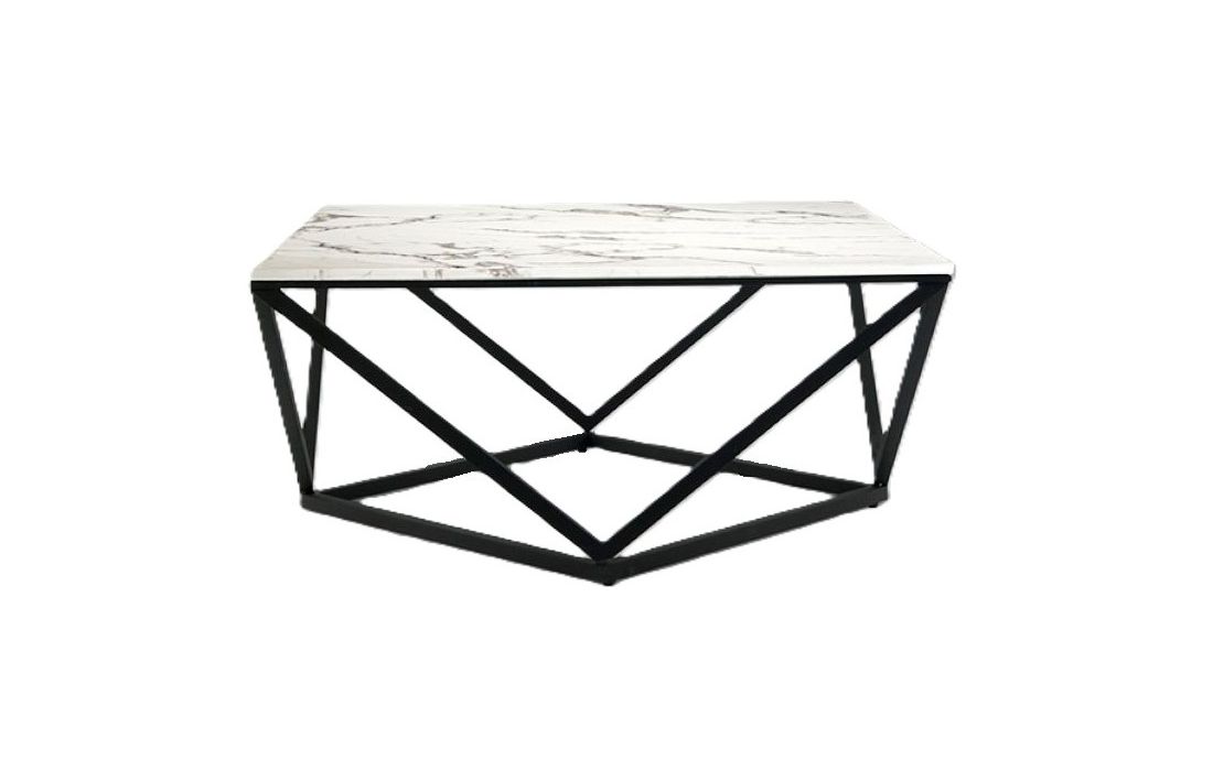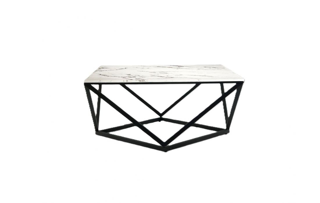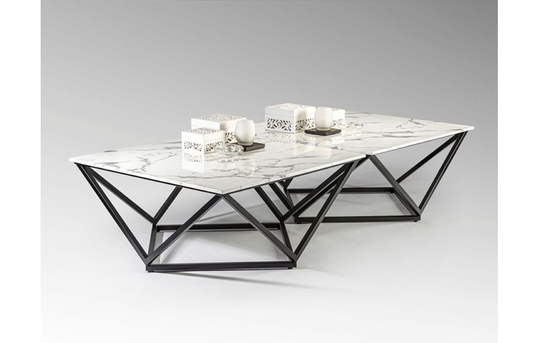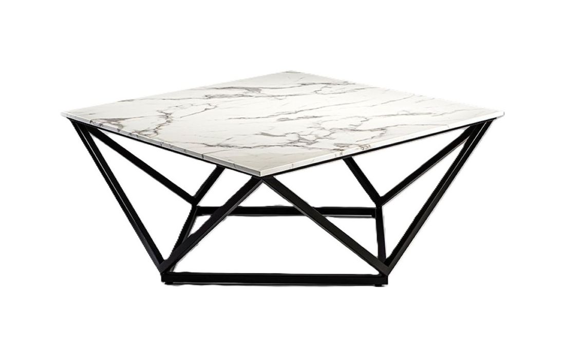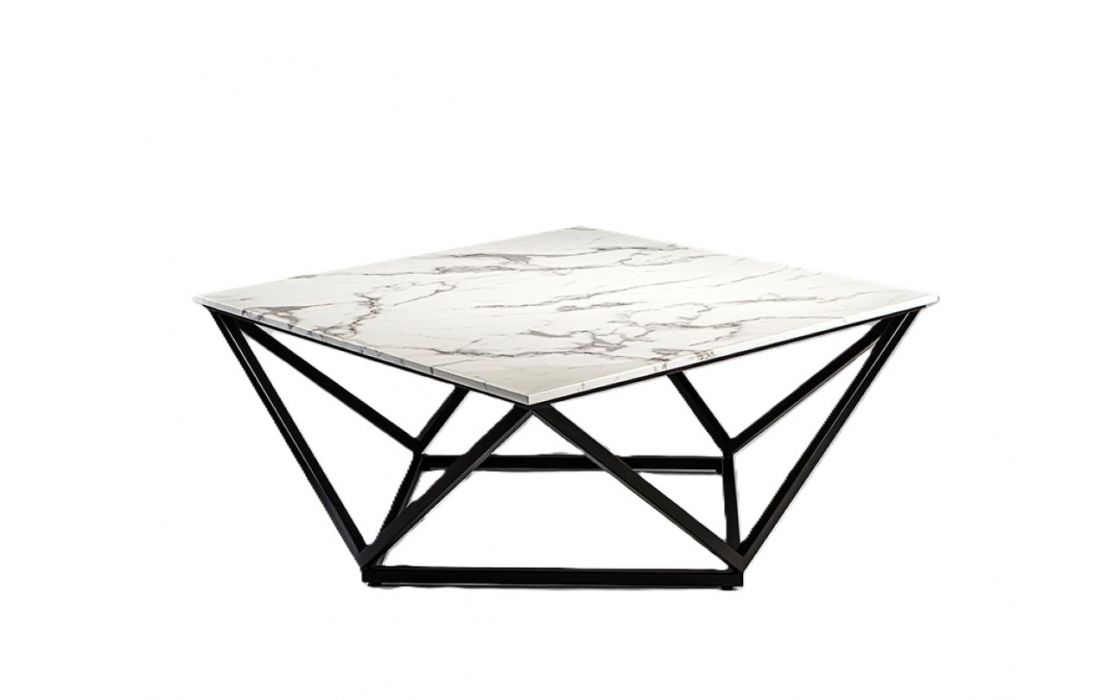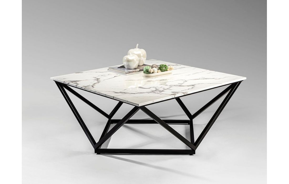 Mesa de centro quadrada, realizada em metal acabamento mate e tampo de pedra artificial em acabamento mármoreDestinatário :