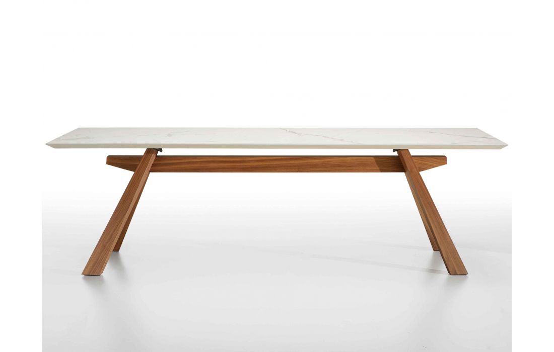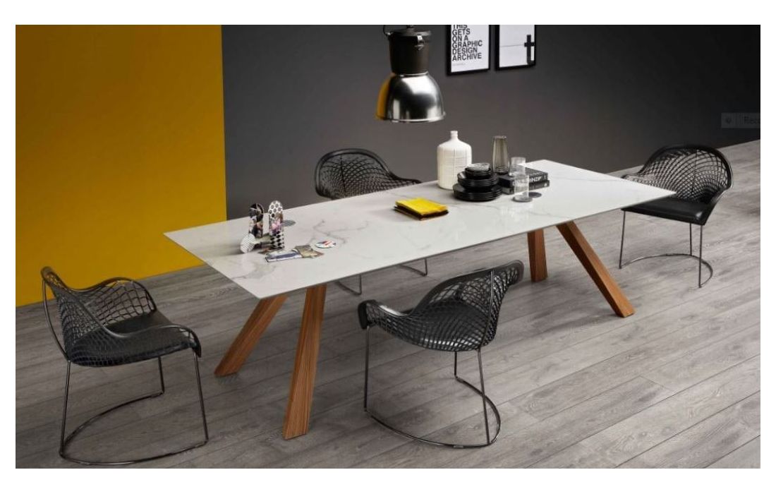 Mesa de jantar com pés em folha de nogueira queimada com tampo em cerâmica com efeitos em mármore