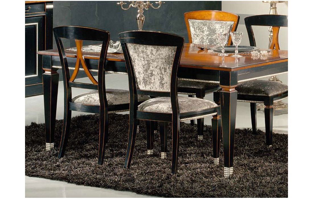 Mesa extensível com 2 extensões, design provençal e pormenor em folha de prata, com possibilidade de vários acabamentos.