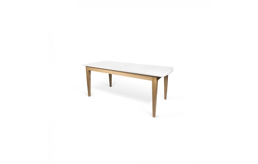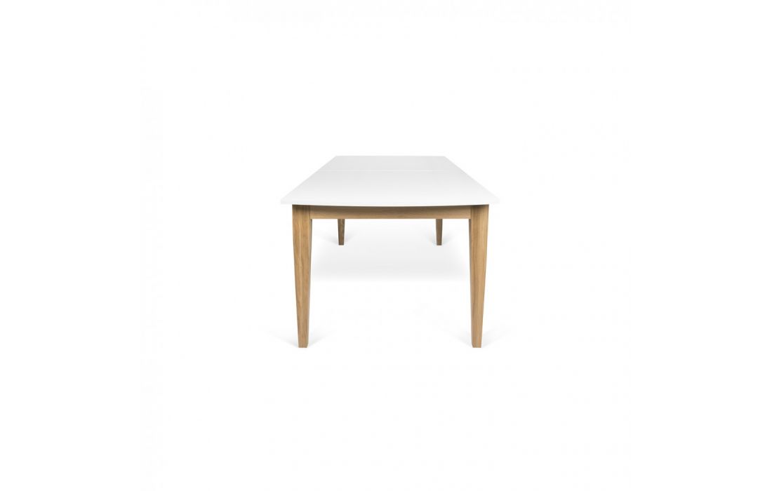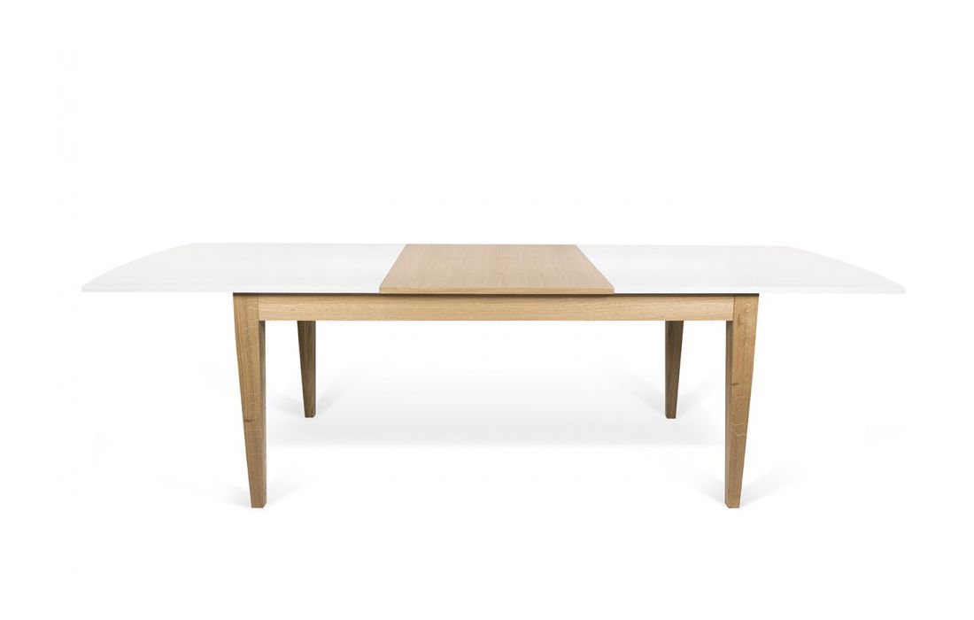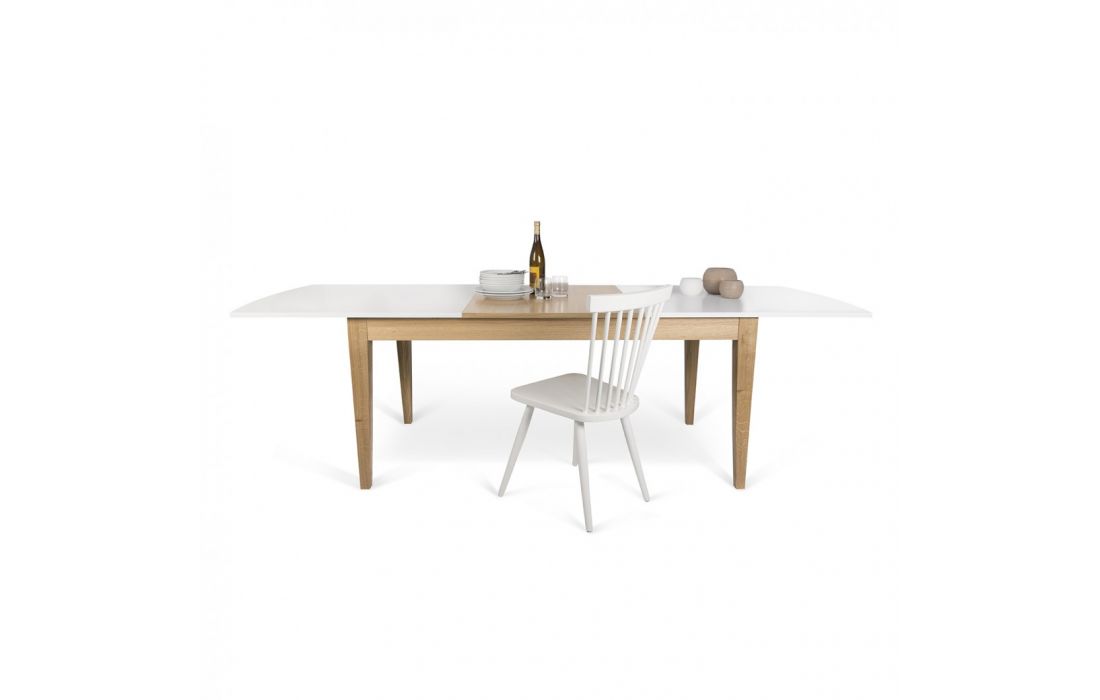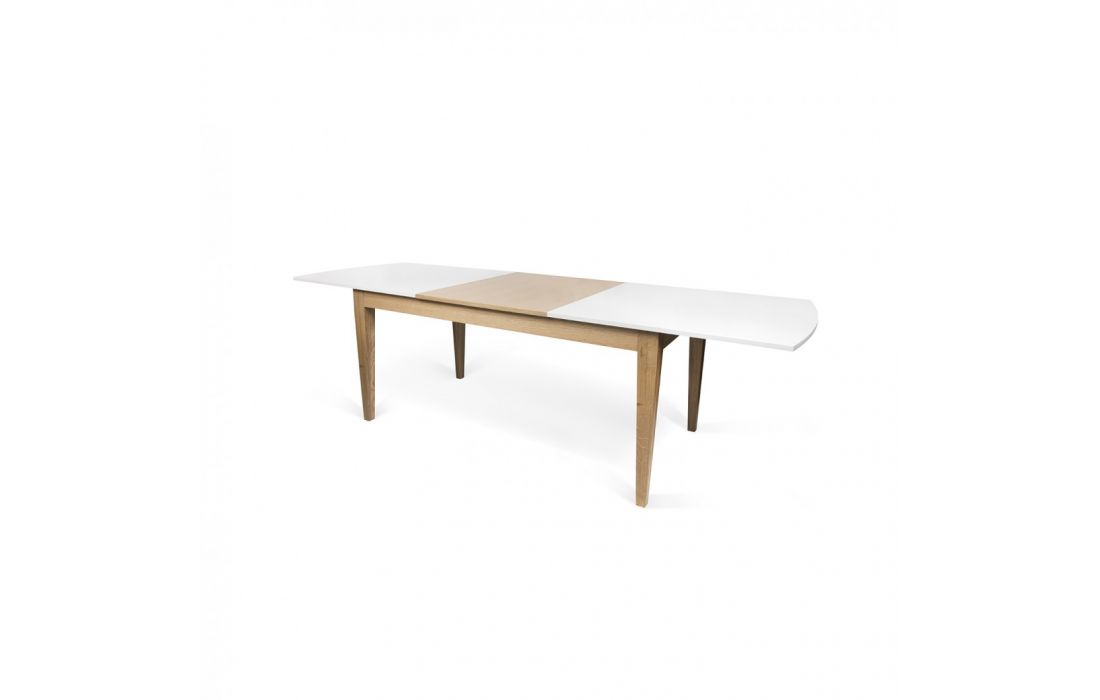 Mesa extensível com base e pernas em madeira maciça, tampo branco e extensão folheada a carvalho natural.