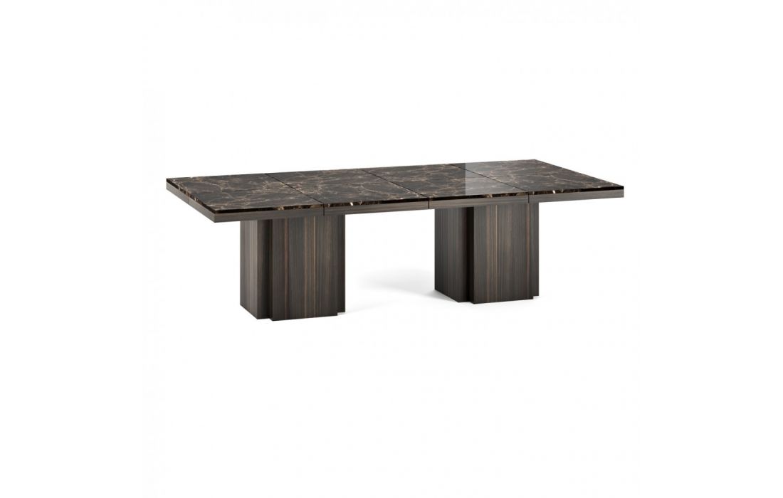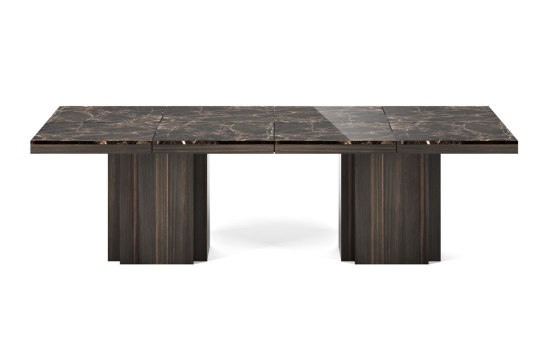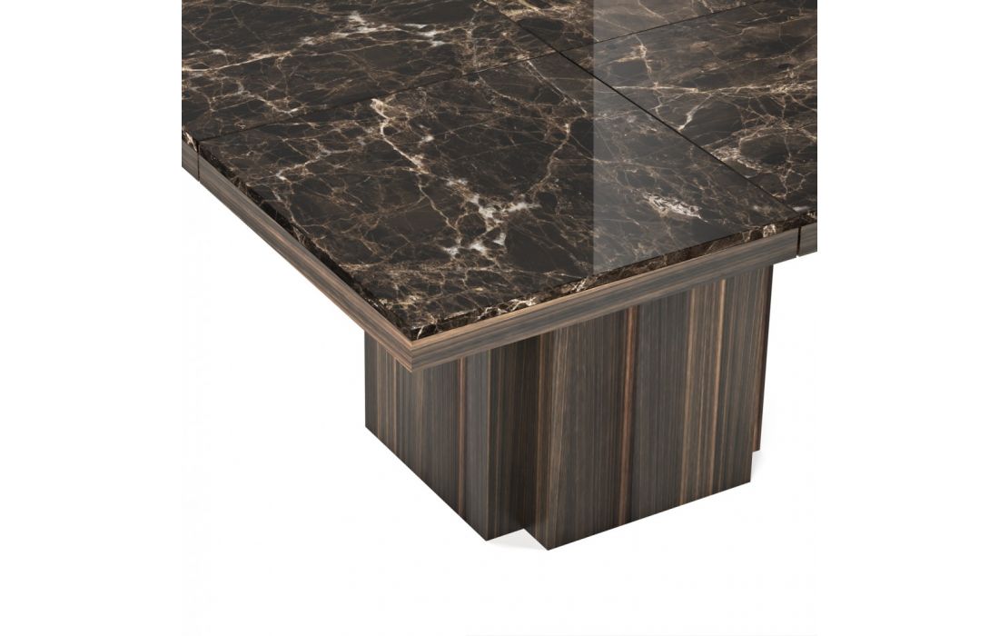 Mesa geométrica, combina 8 tampos quadrados em mármore, unidos por um discreto perfil metálico, com 2 predominantes pés centrais.