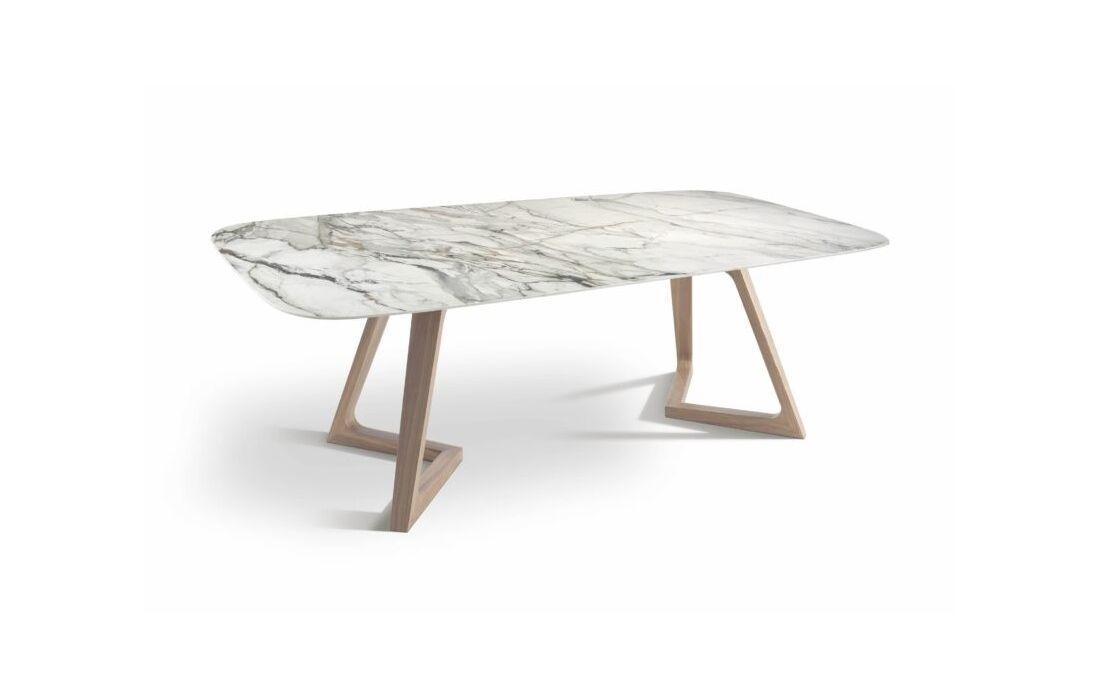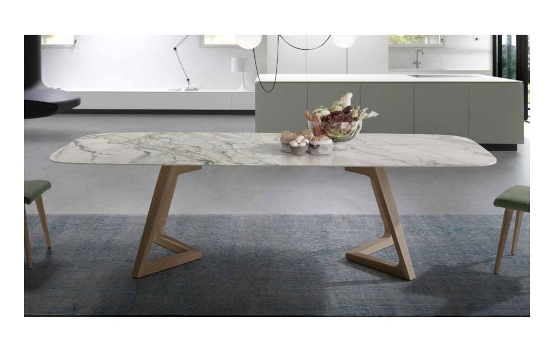 Mesa de jantar com tampo de cerâmica e pés em madeira maciça