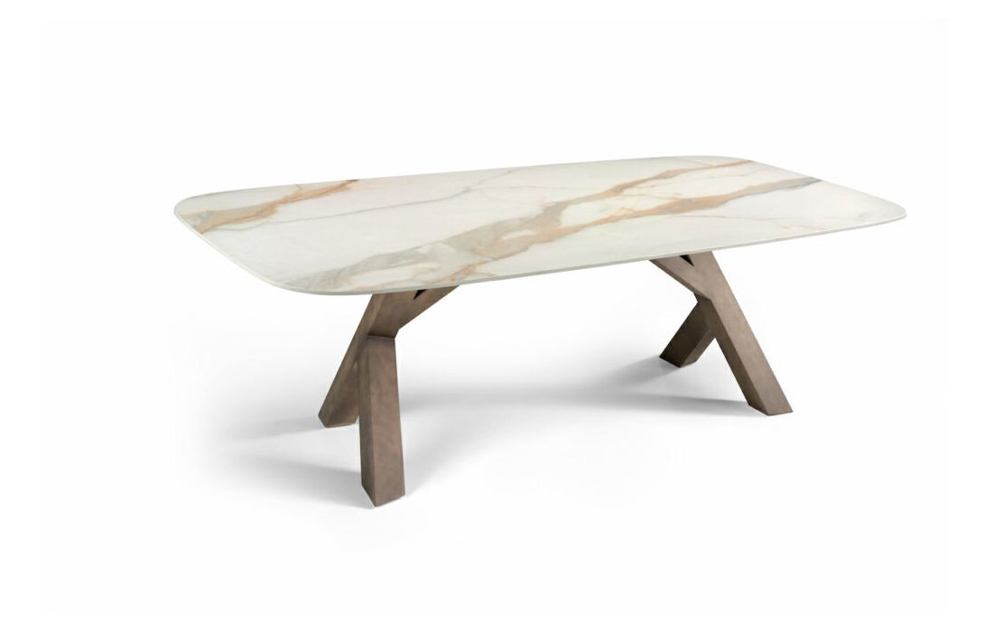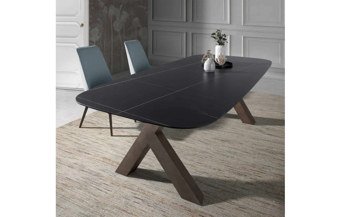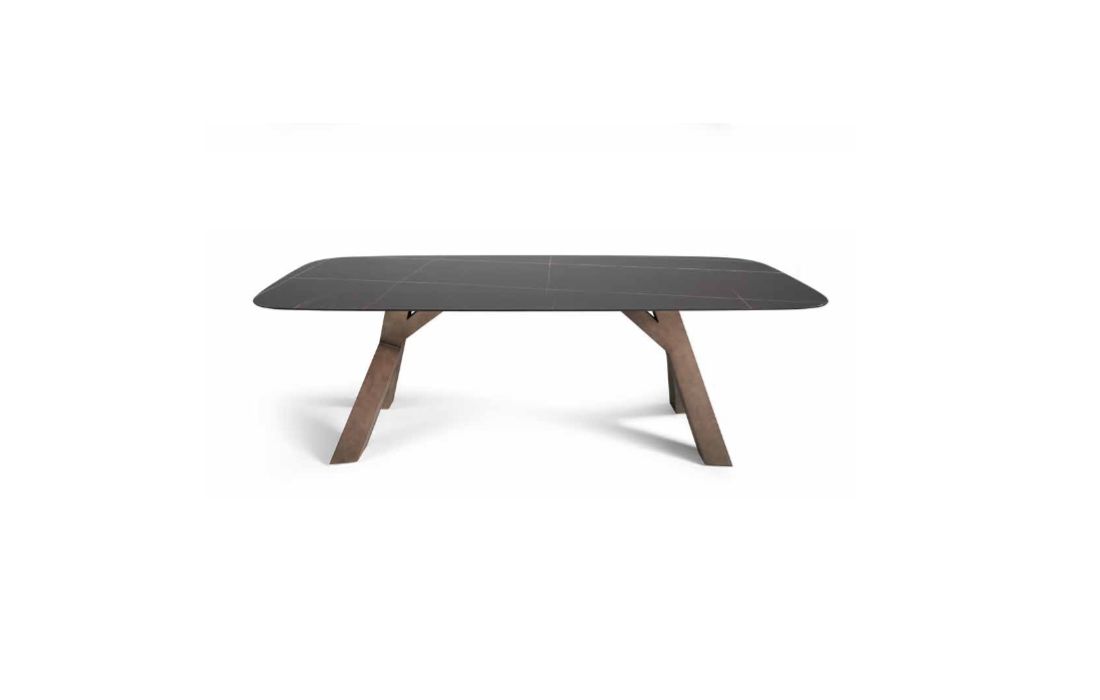 Mesa de jantar com tampo de cerâmica e pés em madeira maciça