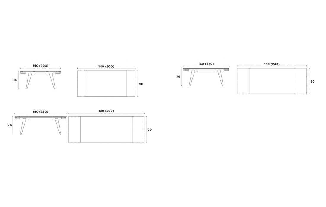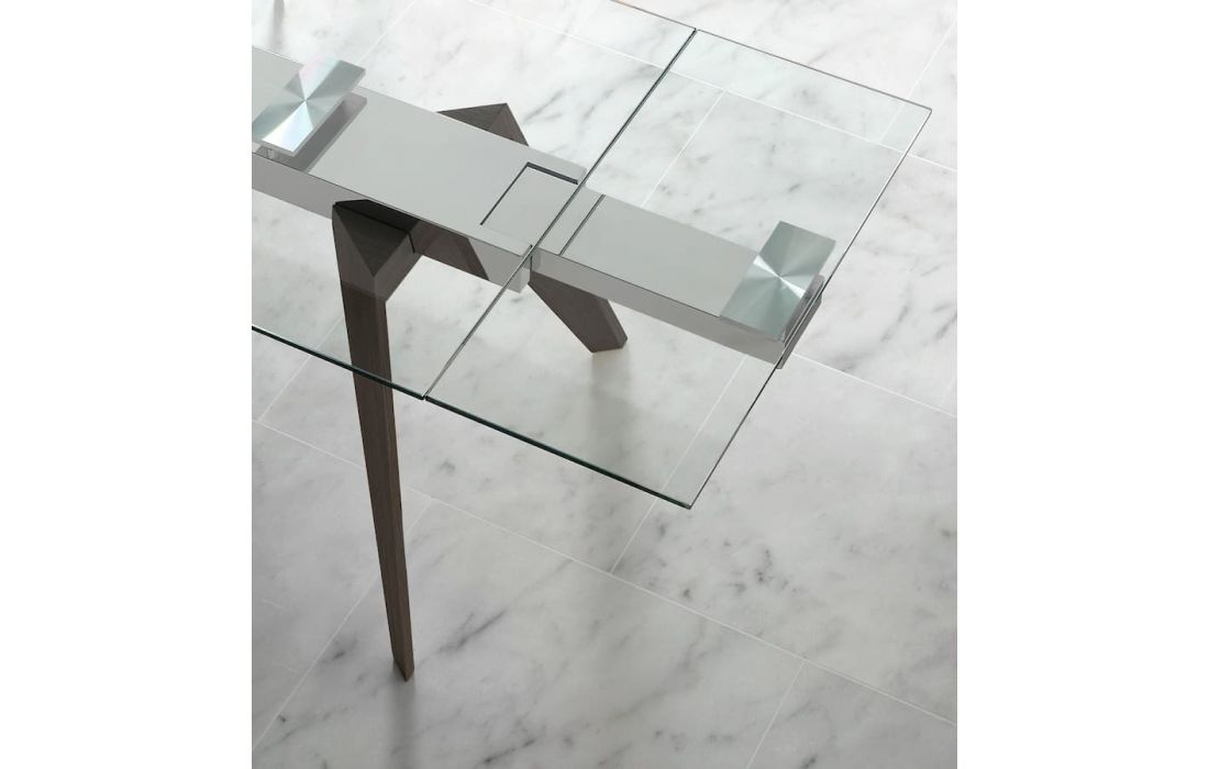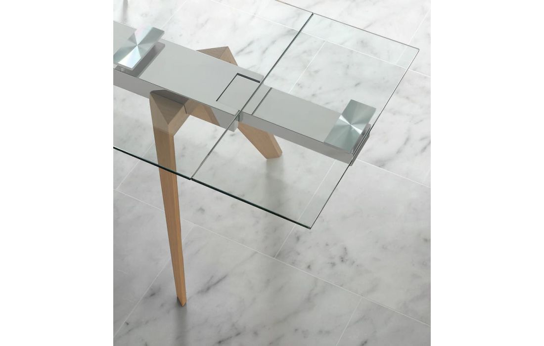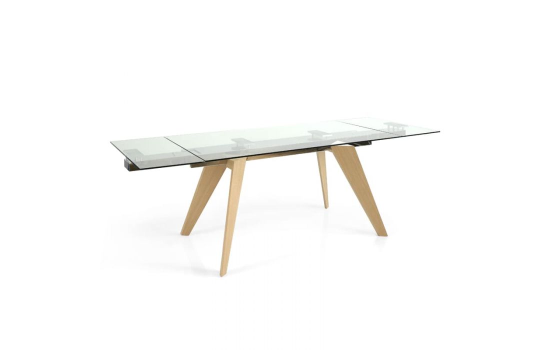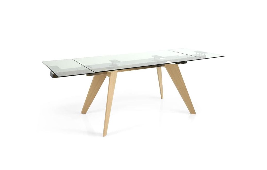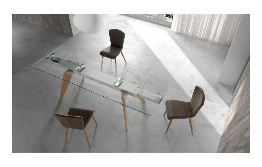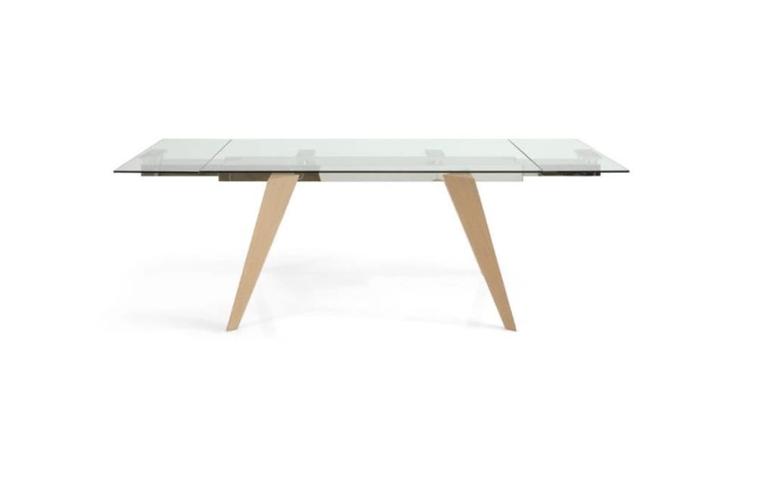 Mesa de jantar extensível com tampo de cerâmica ou vidro e pés em madeira