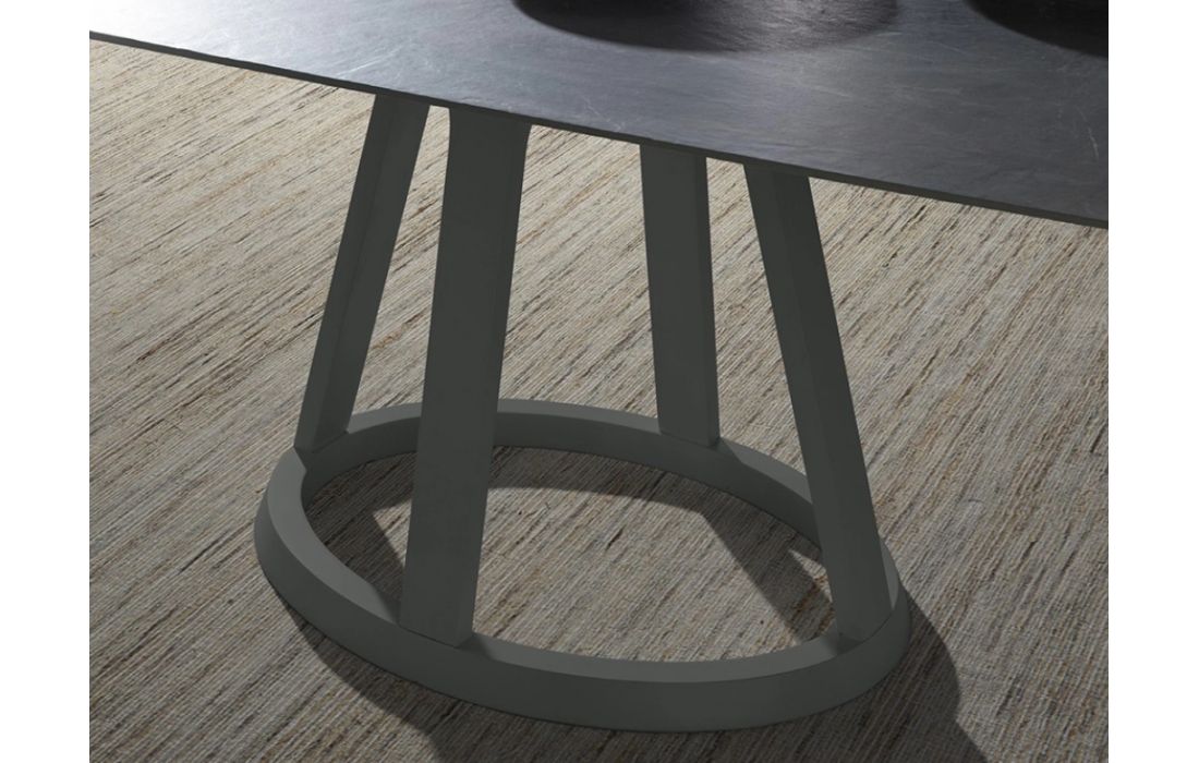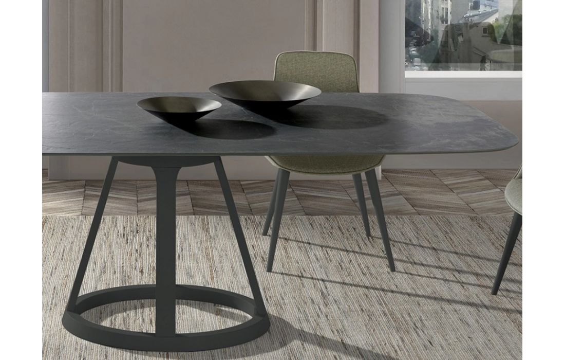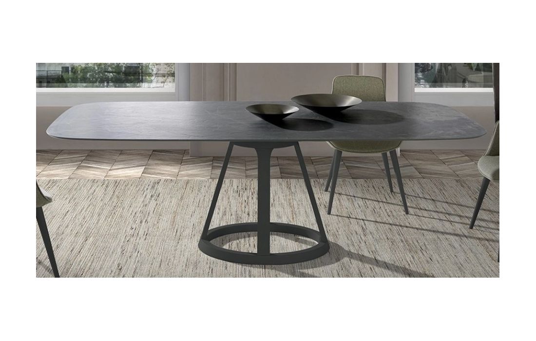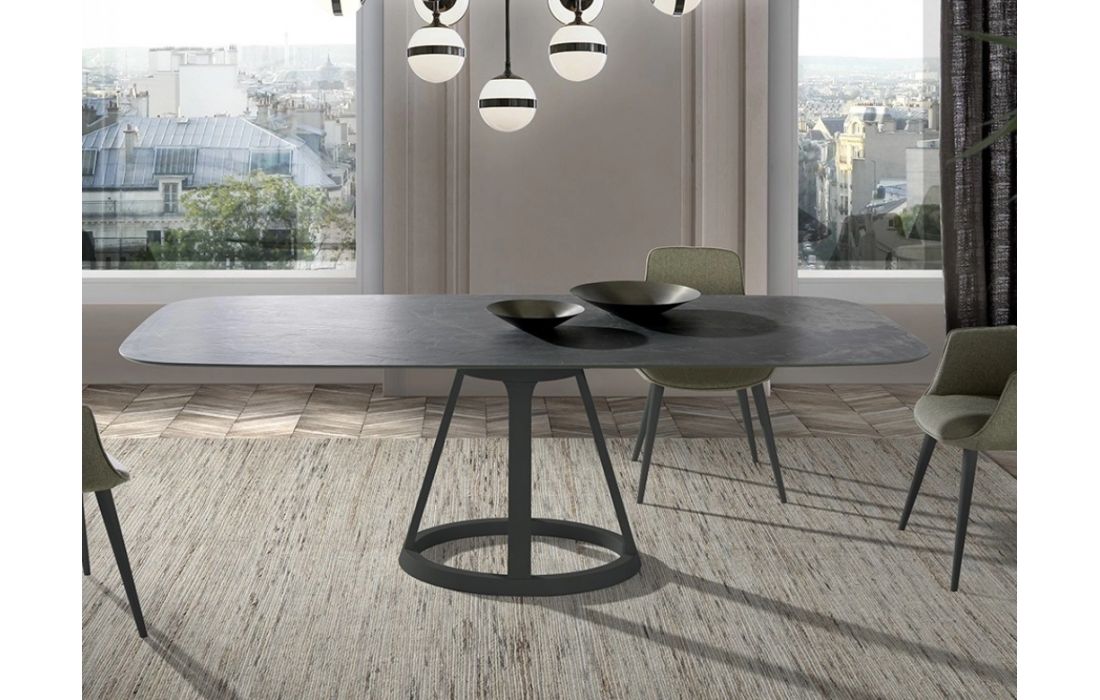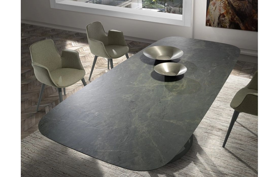 Mesa de jantar com tampo de cerâmica e pés em madeira maciça