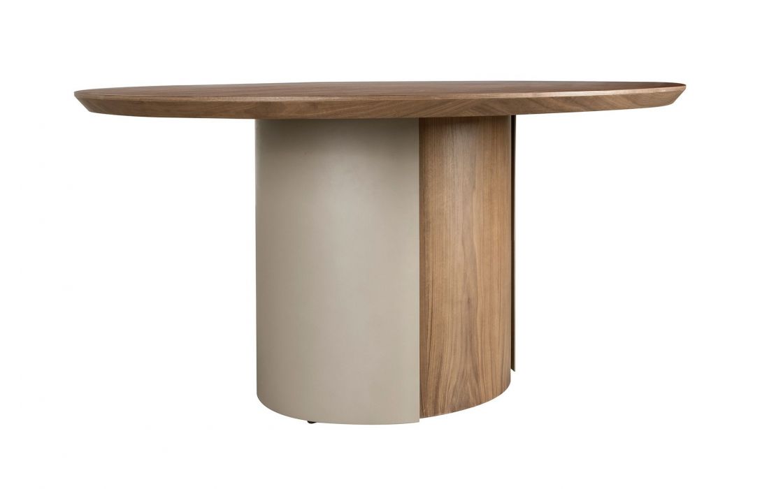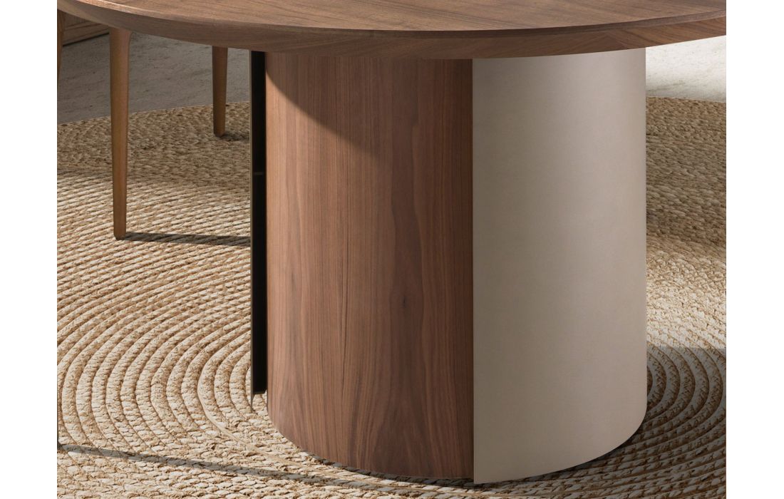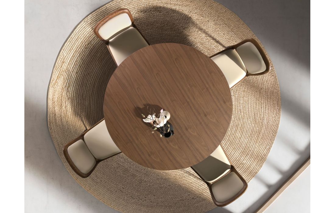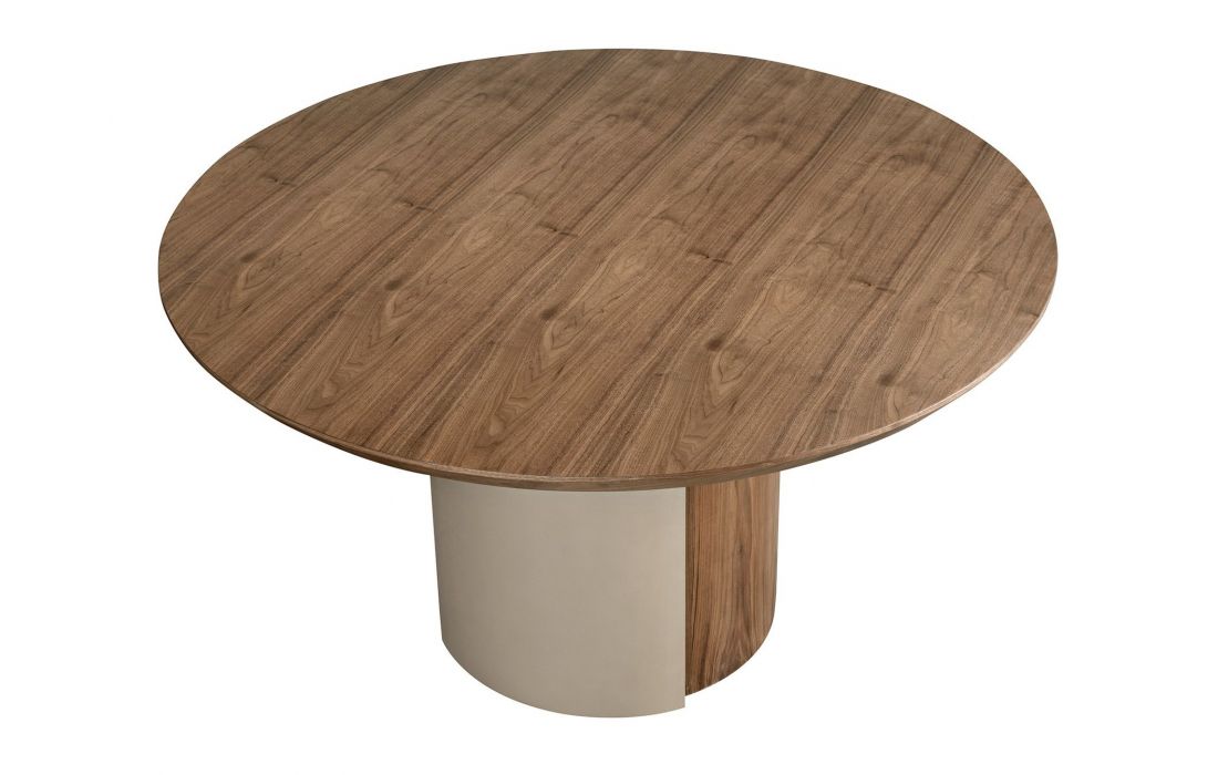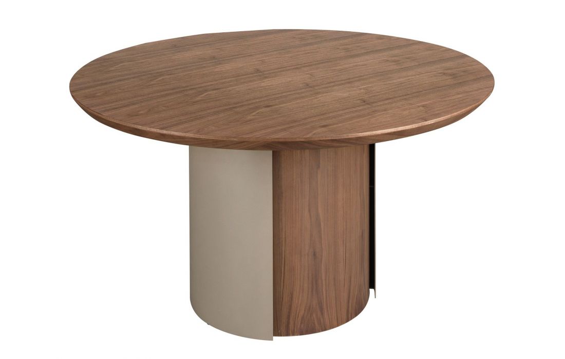 Mesa de jantar redonda moderna com tampo fixo em folha de nogueira natural e pernas em aço inoxidável