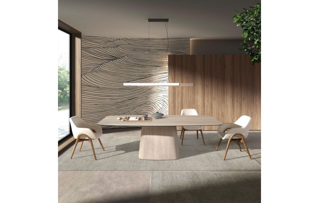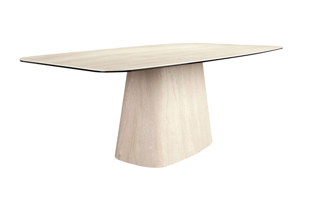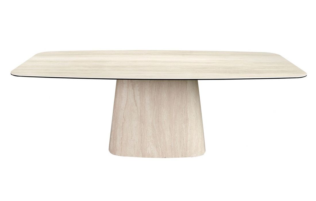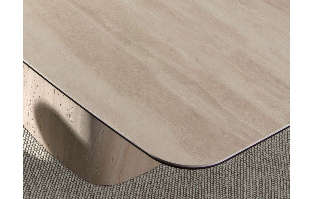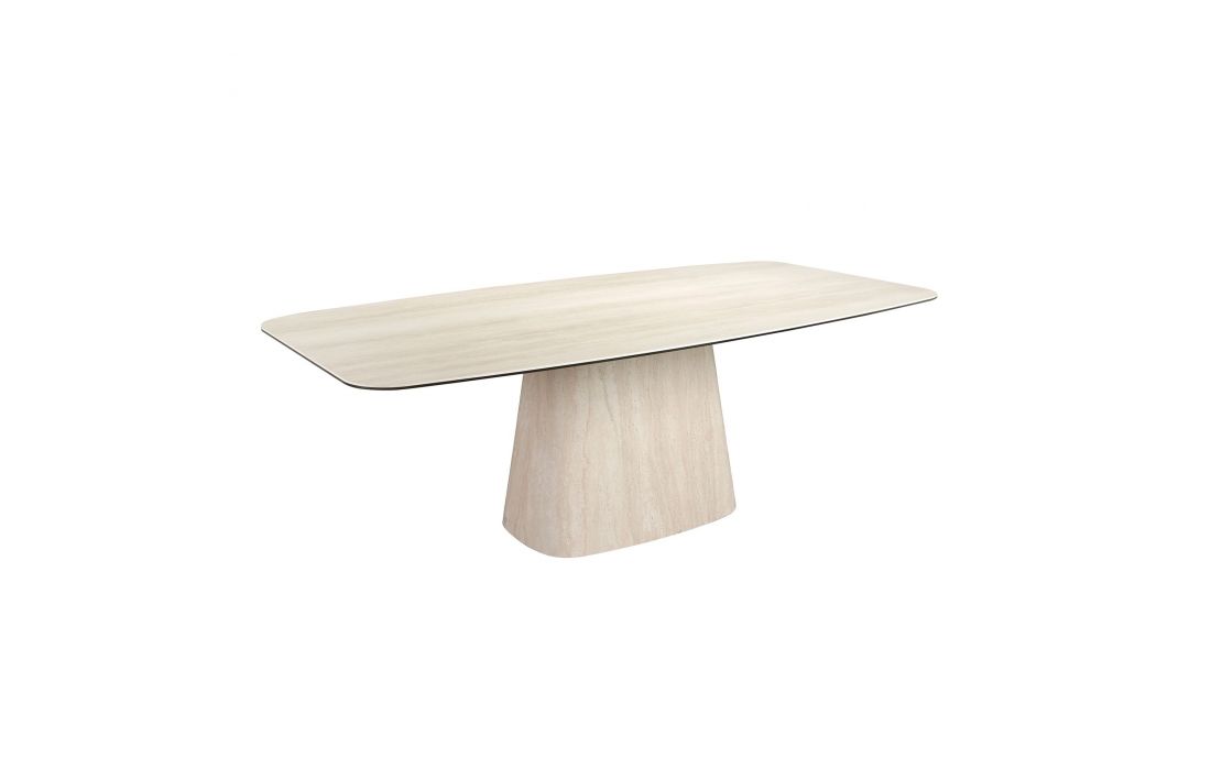 Mesa de jantar retangular de design moderno com tampo fixo e estrutura em mármore porcelânico cor de areia em acabamento mate