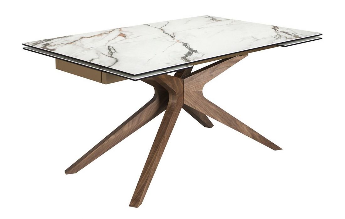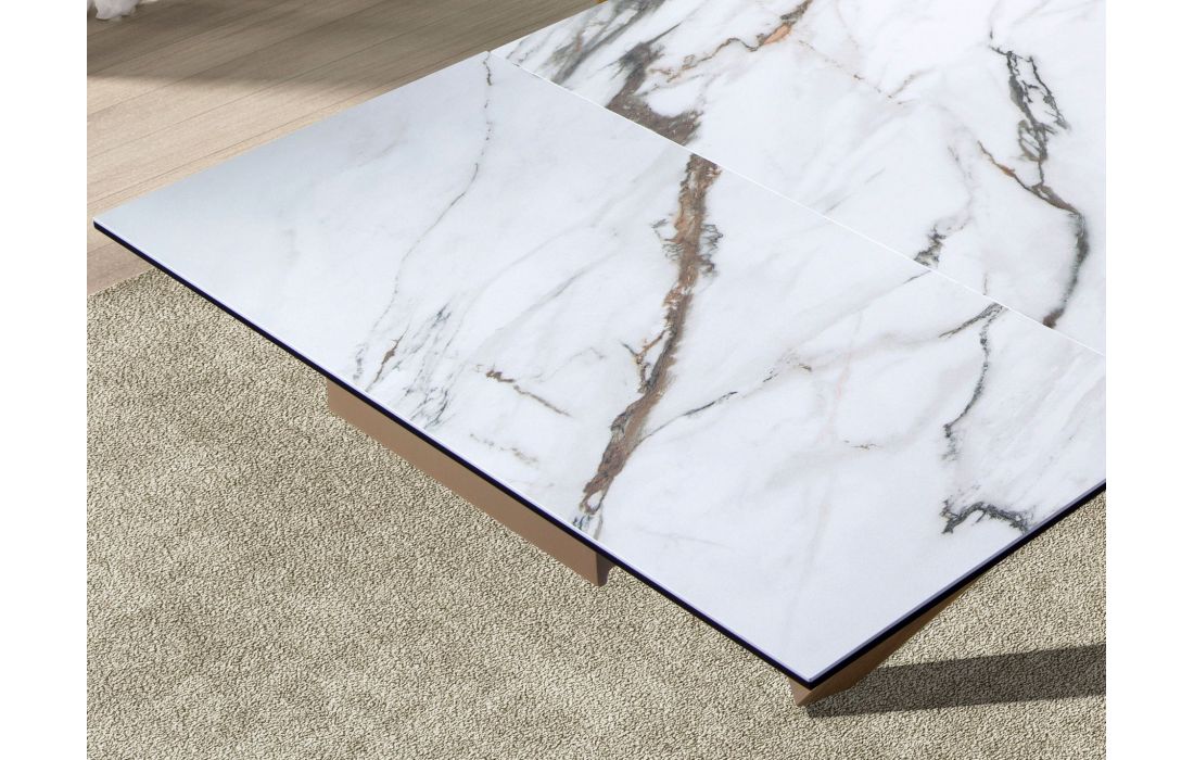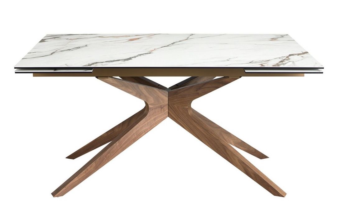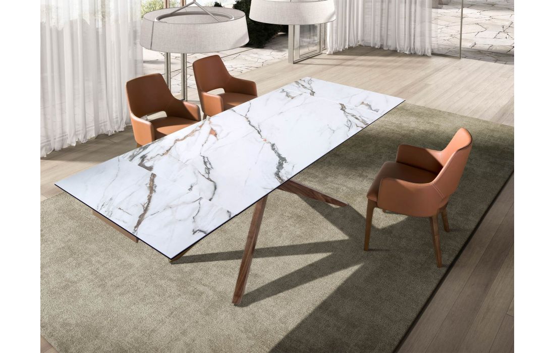 Mesa de jantar extensível retangular de design moderno, com um tampo de mármore branco com veios em tons de cinza e detalhes oxidados em acabamento fosco e suas pernas de madeira folheada a nogueira natural