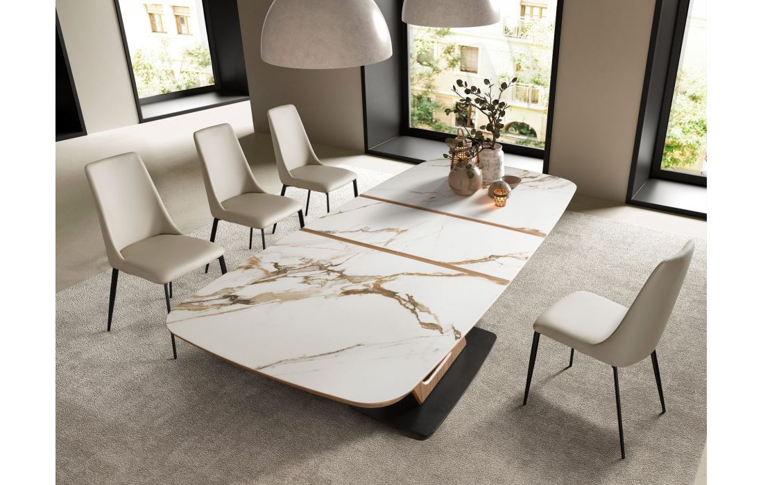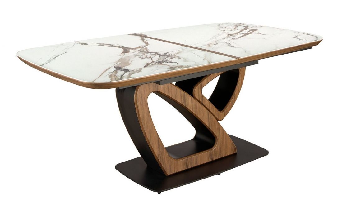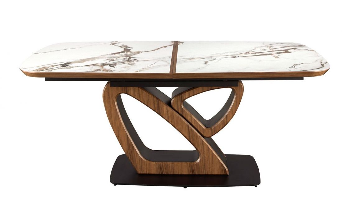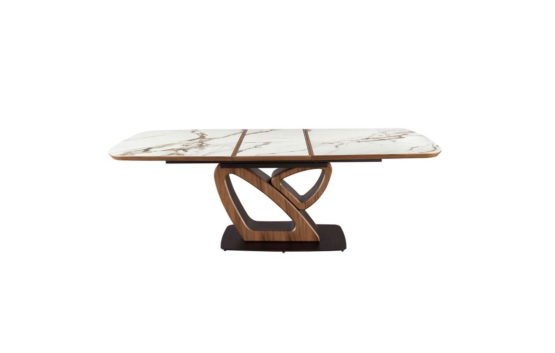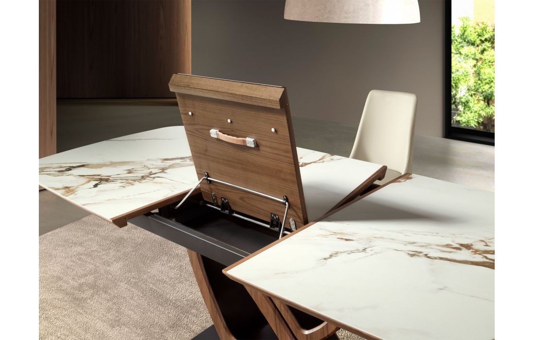 Mesa de jantar extensível retangular de design moderno com tampo de mármore porcelânico branco com veios cinzentos e castanhos em acabamento mate e suas pernas de madeira folheadas a nogueira natural