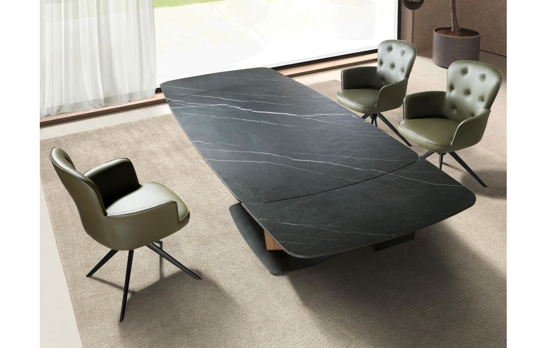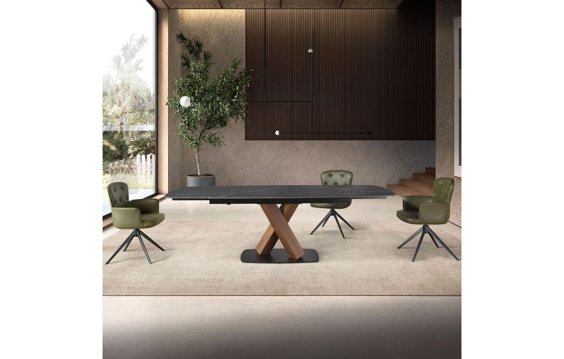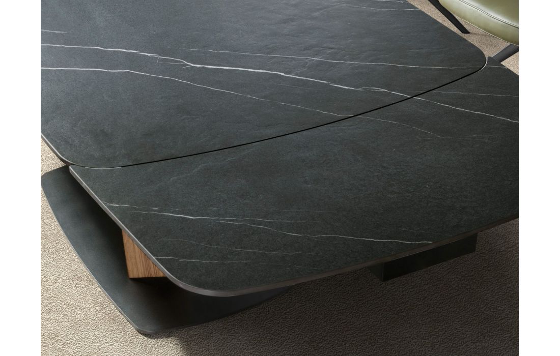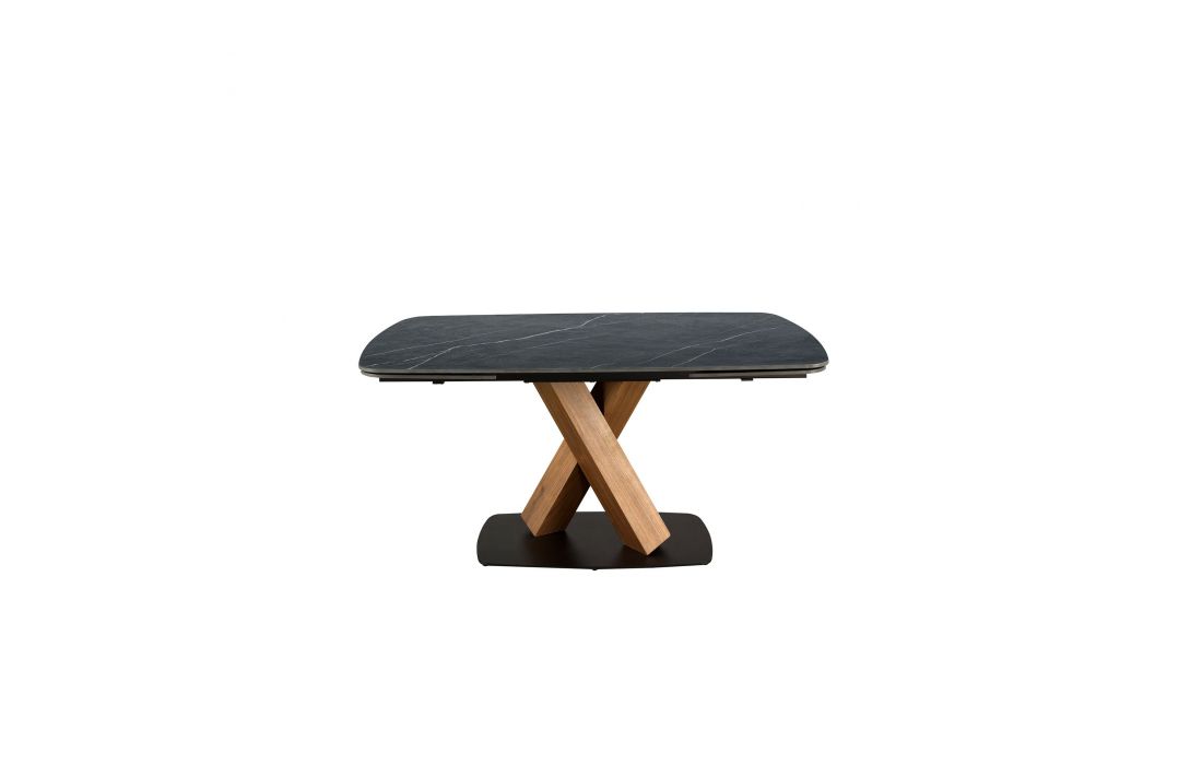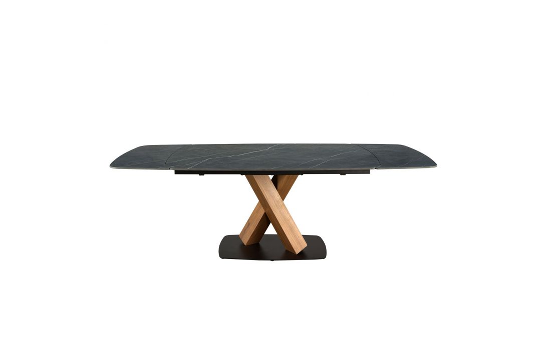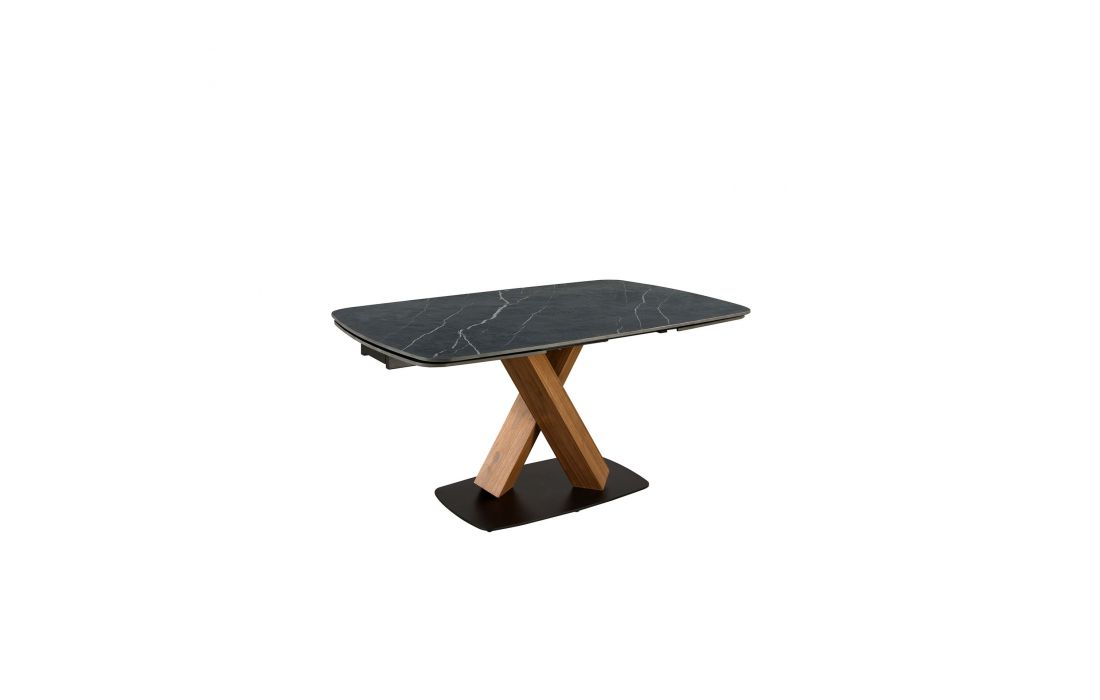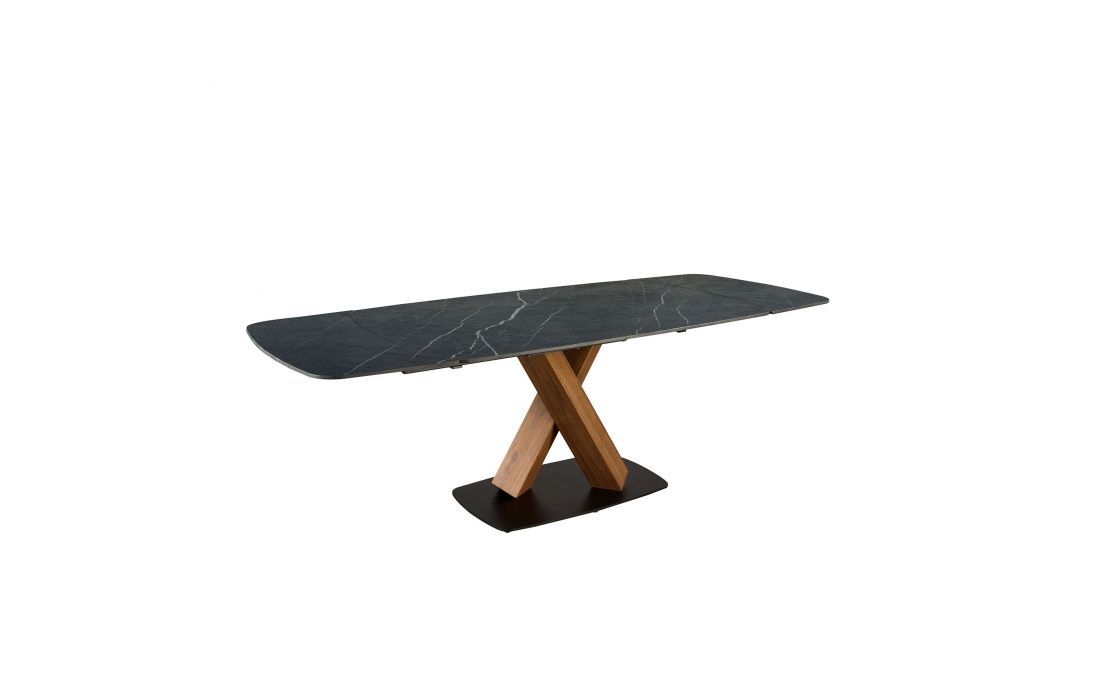 Mesa de jantar extensível retangular de design moderno com tampo em mármore preto com veios de efeito pedra branca em acabamento acetinado e suas pernas de madeira folheadas a nogueira natural, juntamente com a sua base de aço inoxidável pintada a epóxi preto