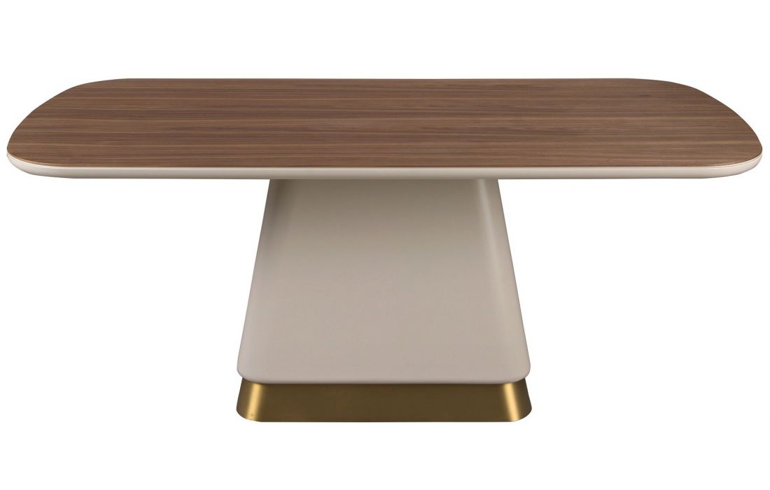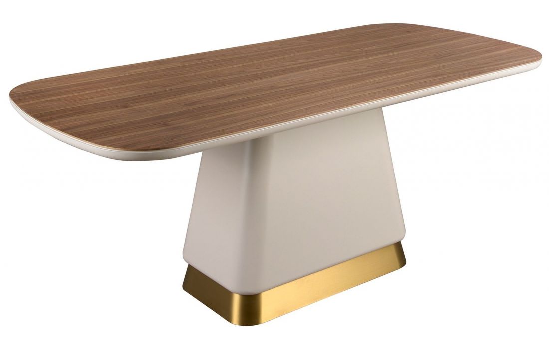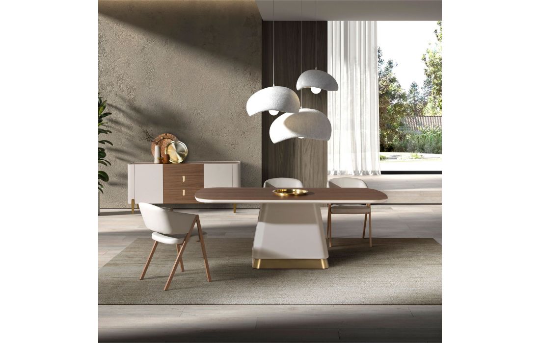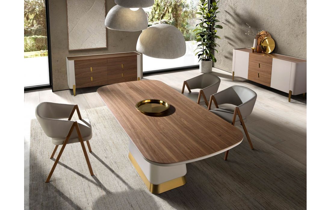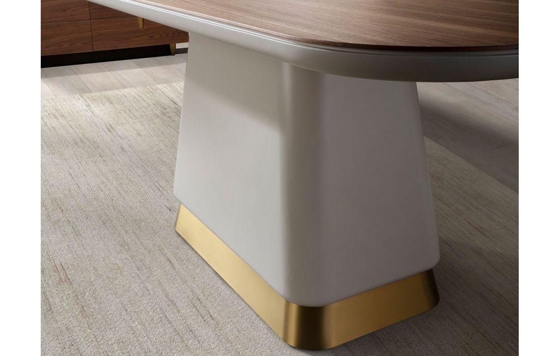 Mesa de jantar oval com tampo fixo e estrutura em folheado de nogueiraDestinatário :