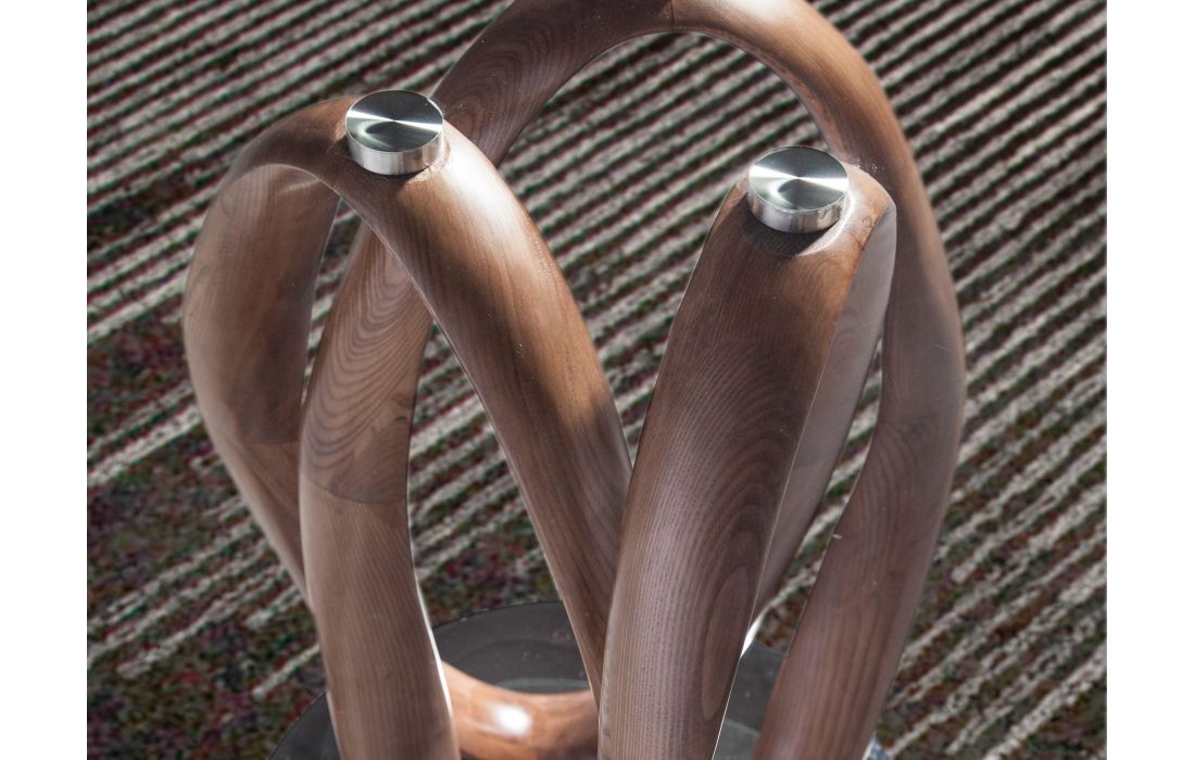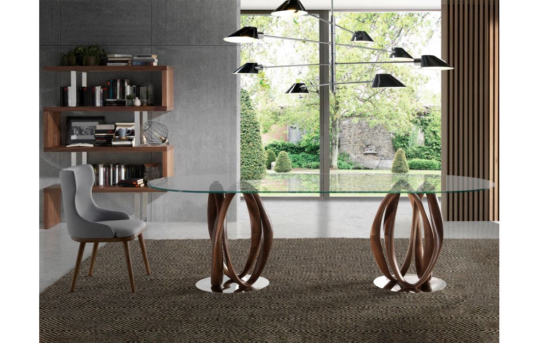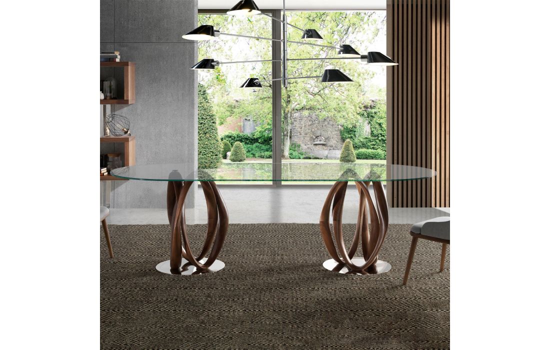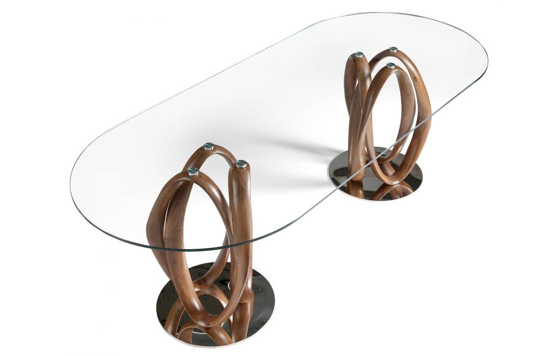 Mesa de jantar oval com tampo de vidro fixo e pernas em madeira de nogueira com uma base em aço inoxidávelDestinatário :