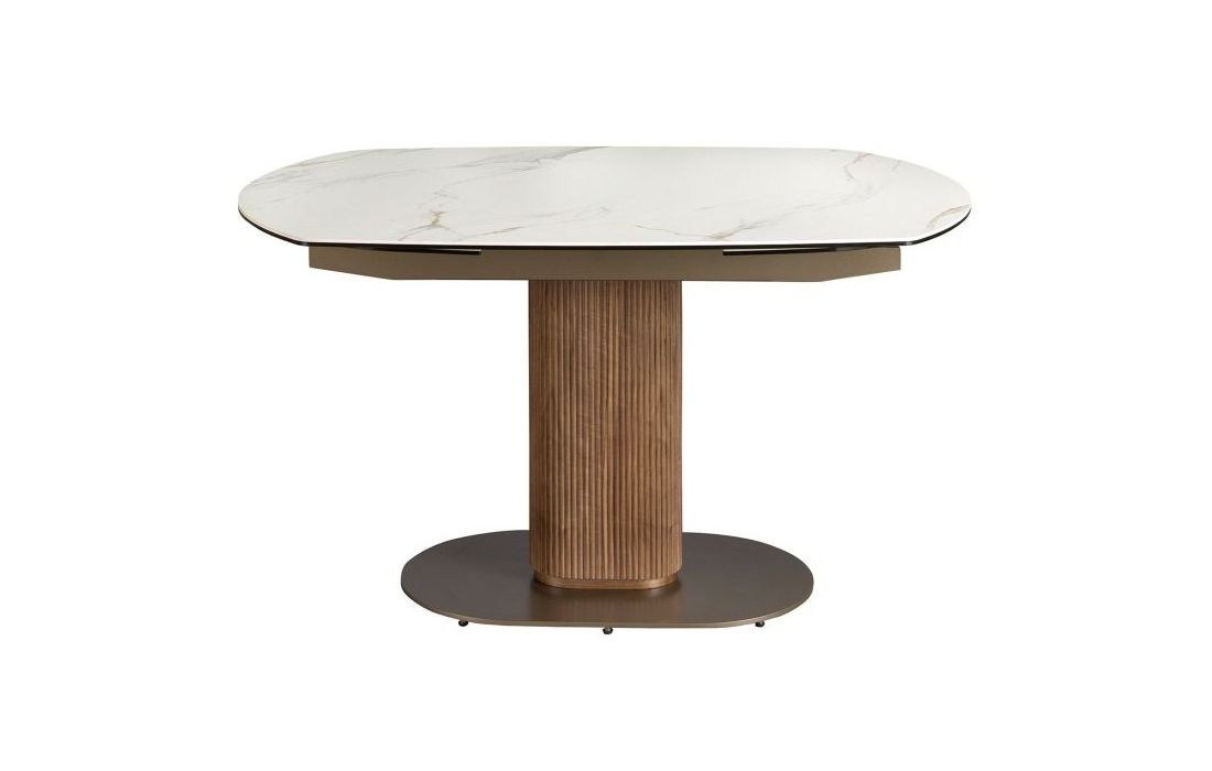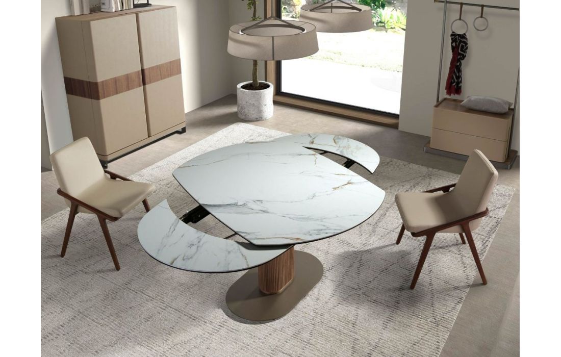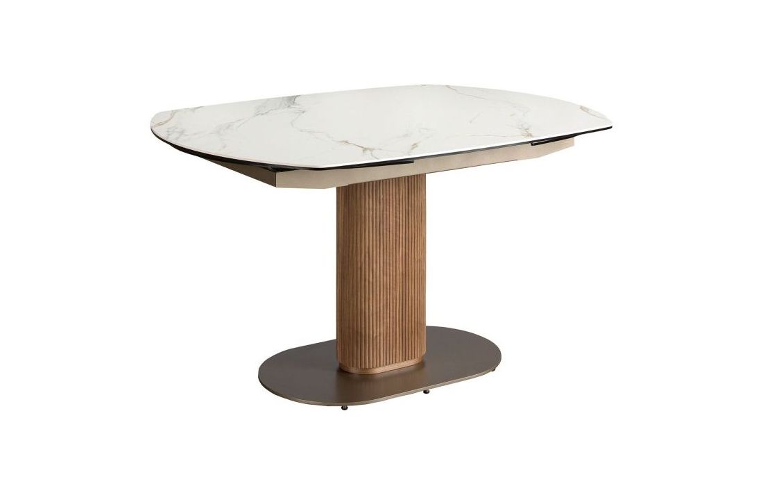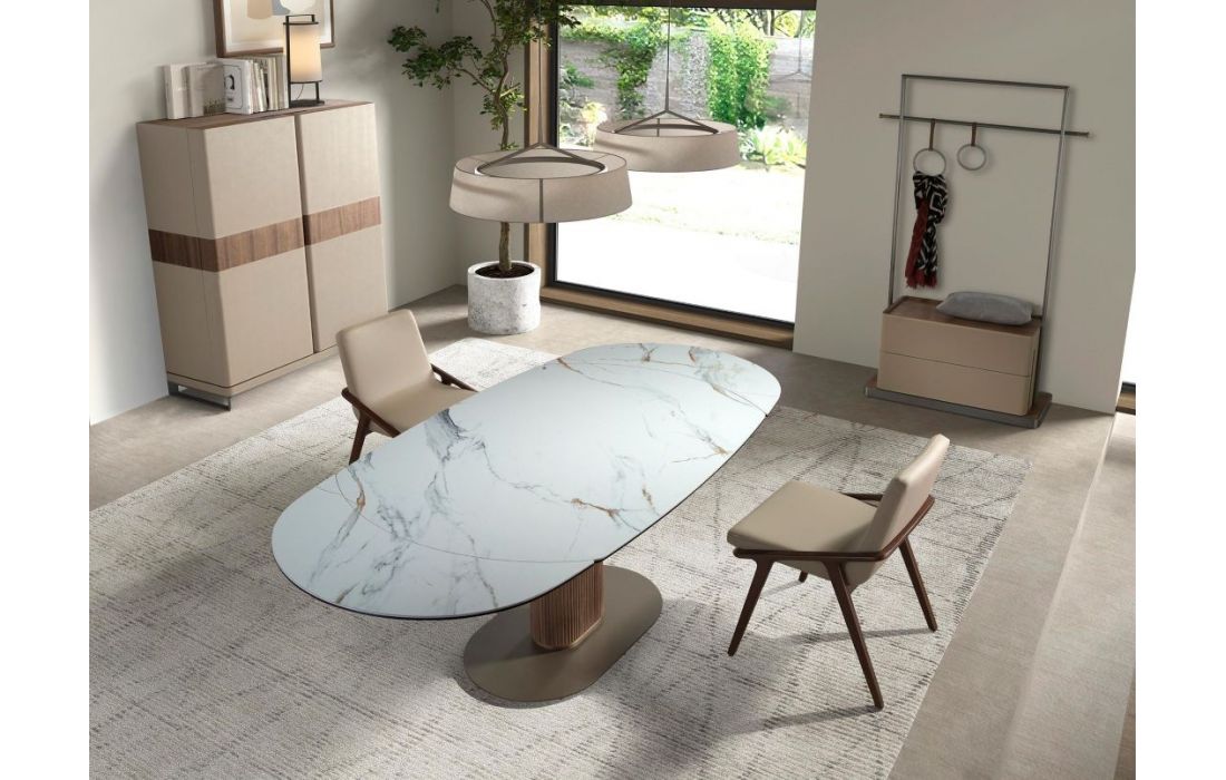 Mesa de jantar oval extensível de design moderno com tampo em mármore com acabamento brilhante e as suas pernas de madeira na cor nogueira, juntamente com a sua base em aço inoxidávelDestinatário :