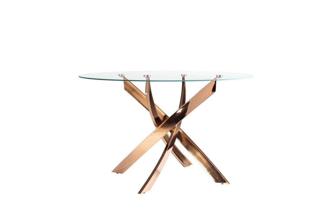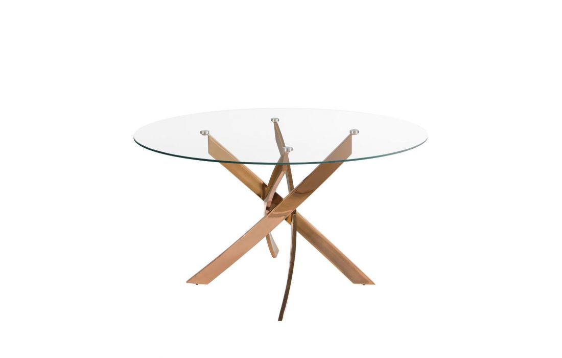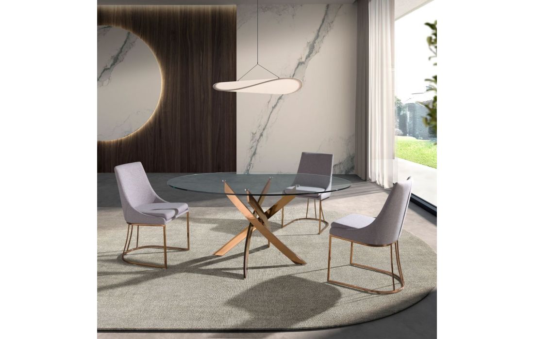 Mesa de jantar redonda moderna com tampo fixo em vidro temperado e as suas pernas de aço inoxidável cromadoDestinatário :