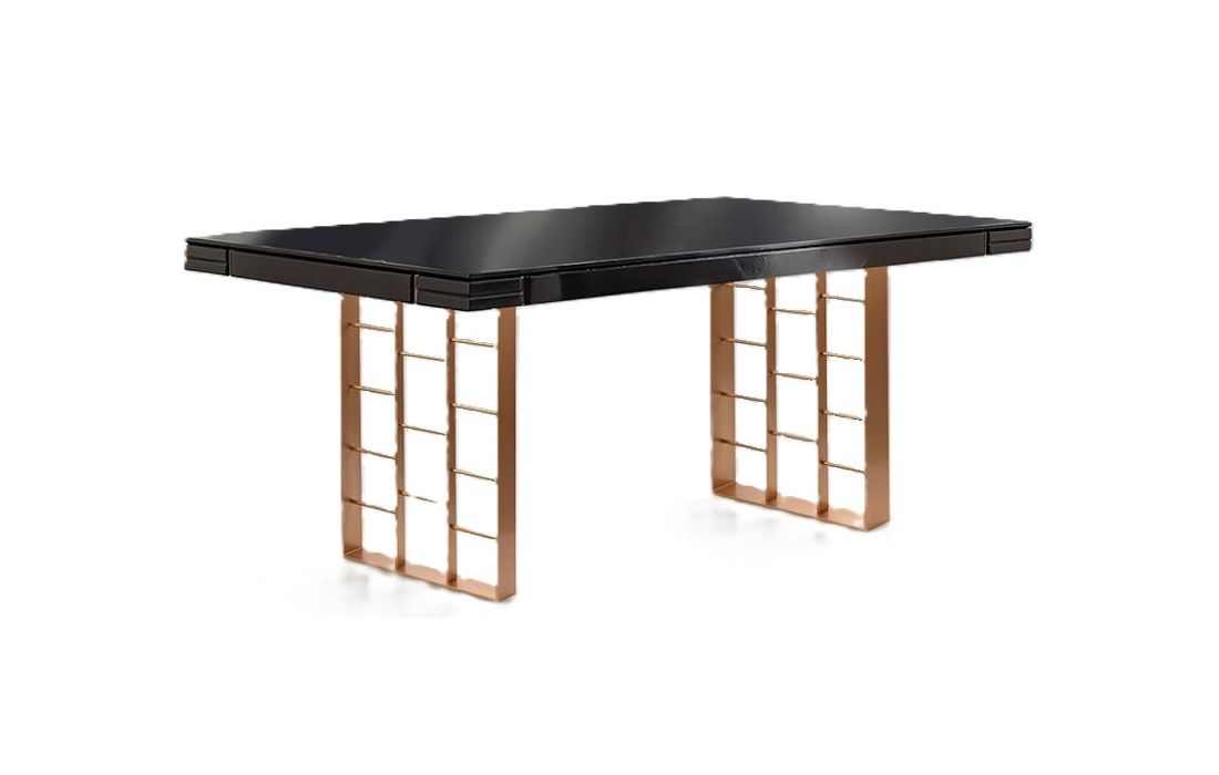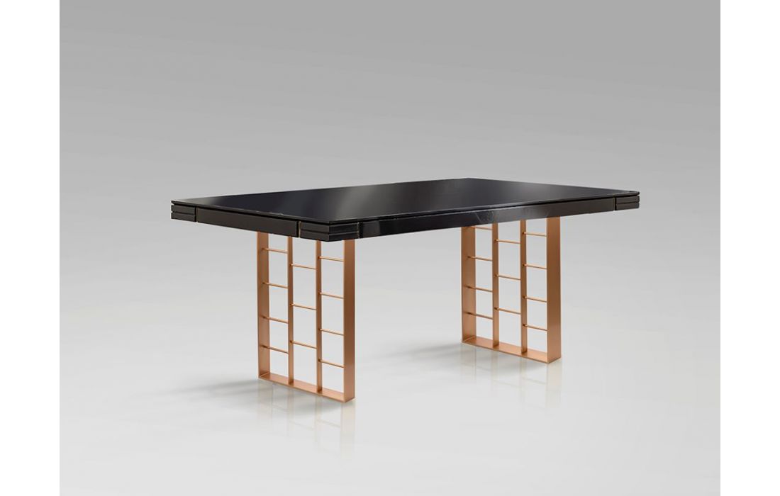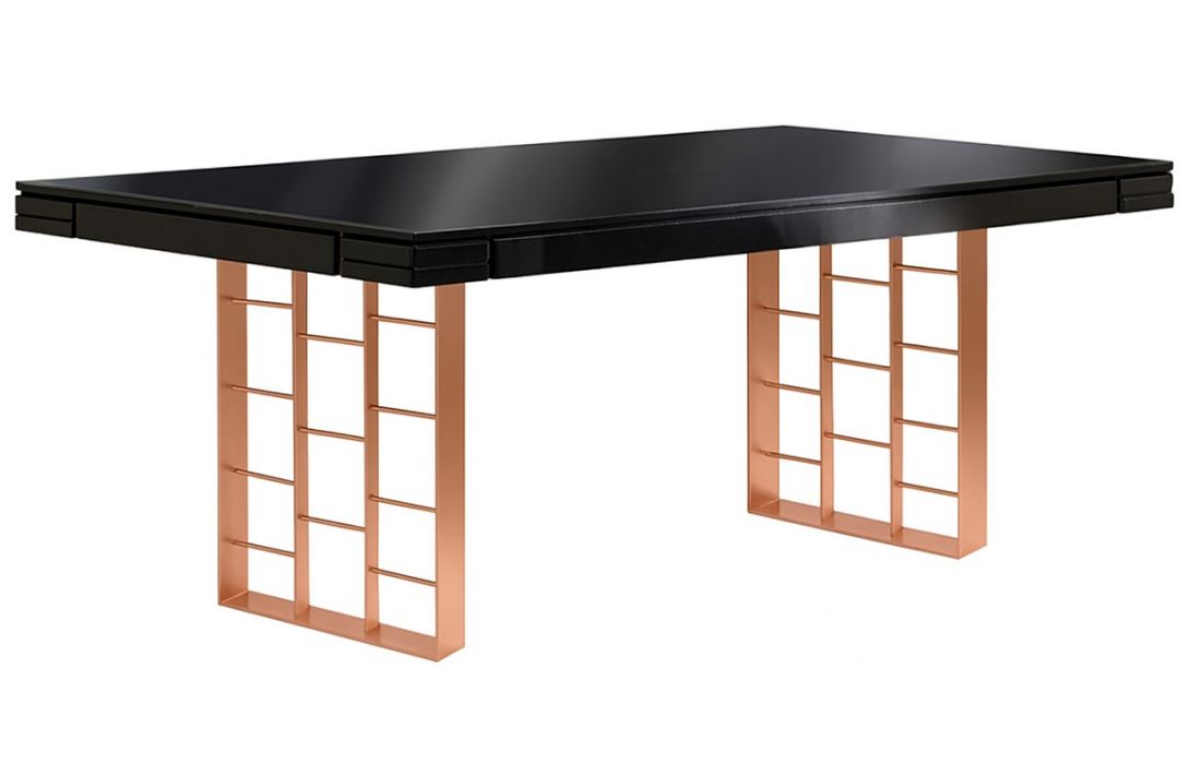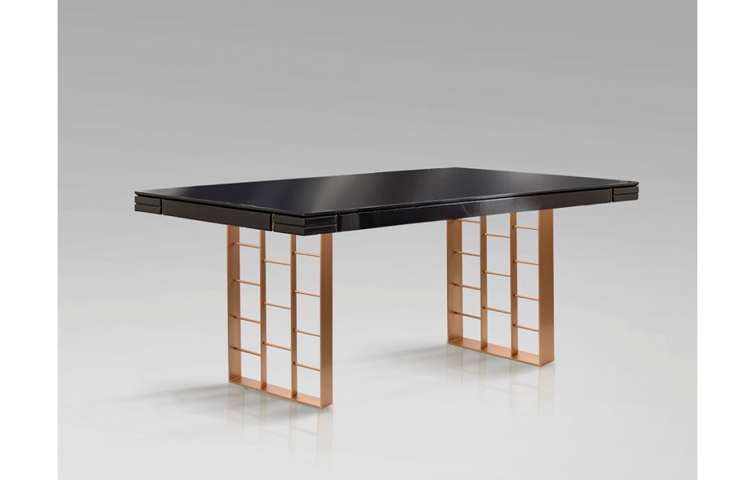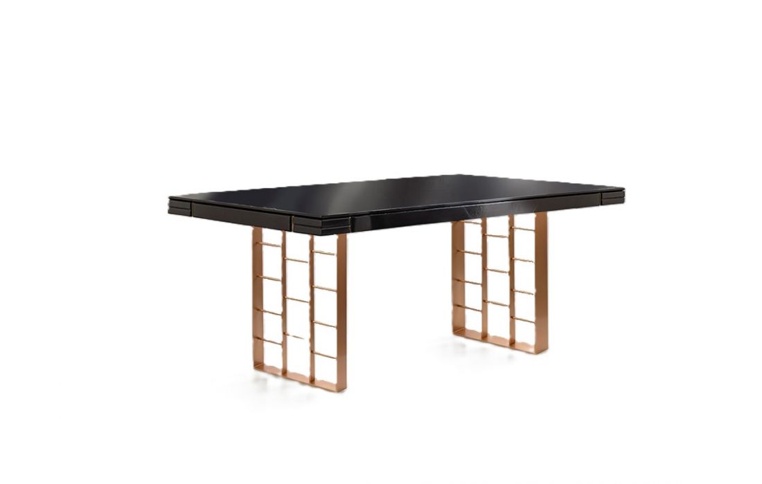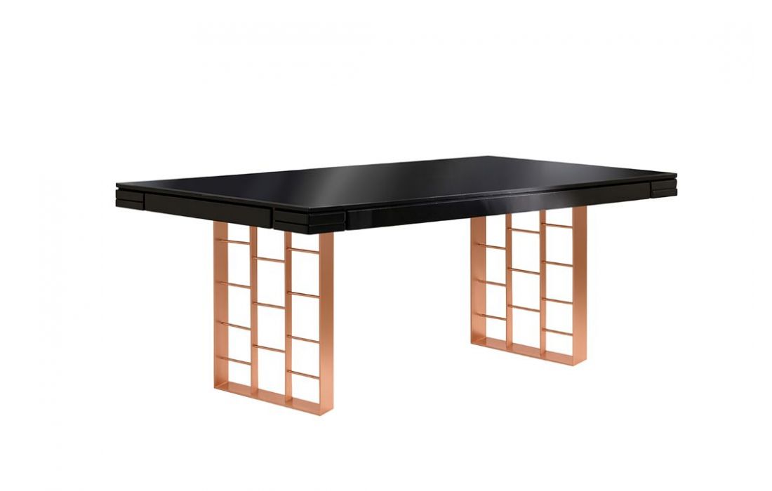 Mesa de jantar em MDF com ranhuras decorativas e placas douradas e pés em metalDestinatário :