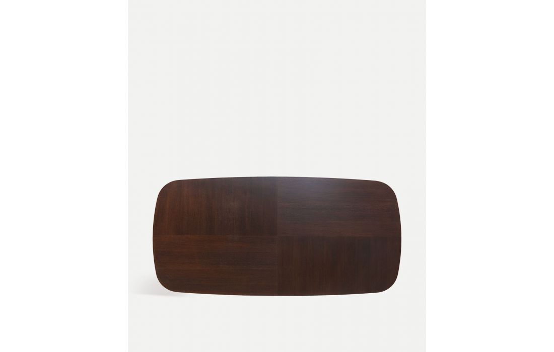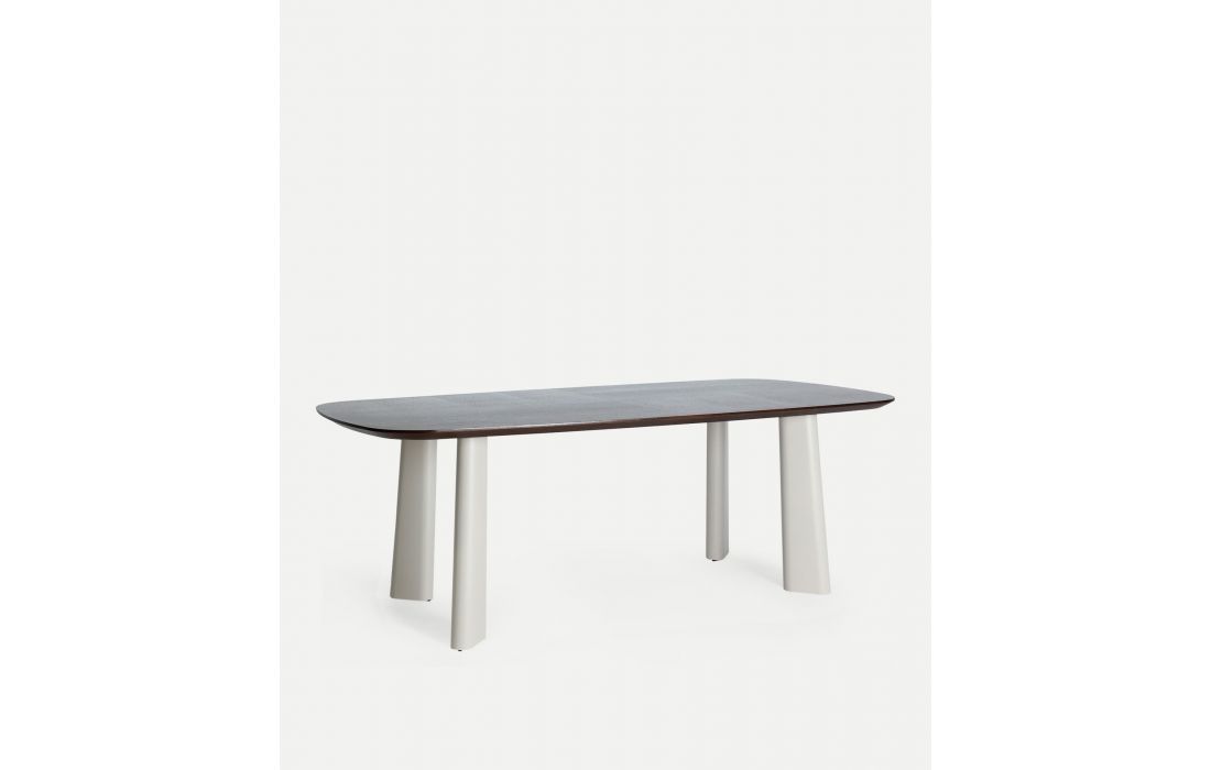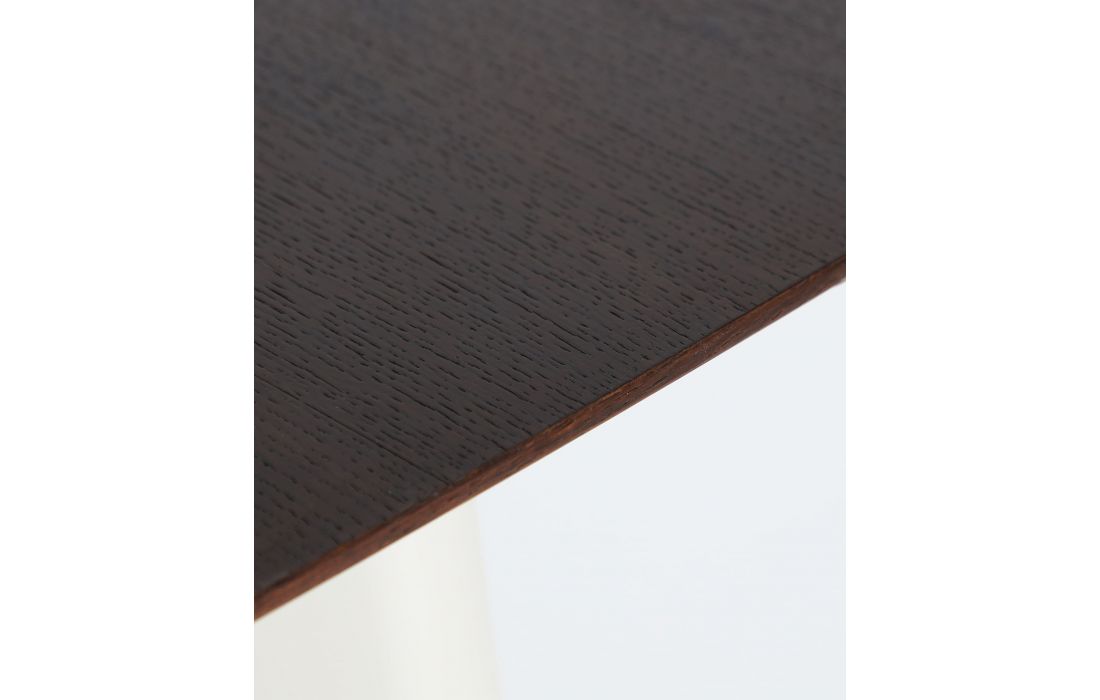 Esta mesa de jantar em design contemporâneo, feita em MDF em marrom, com folheado de carvalho em tom creme e estrutura de ferro, traz equilíbrio e caráter para o espaço.