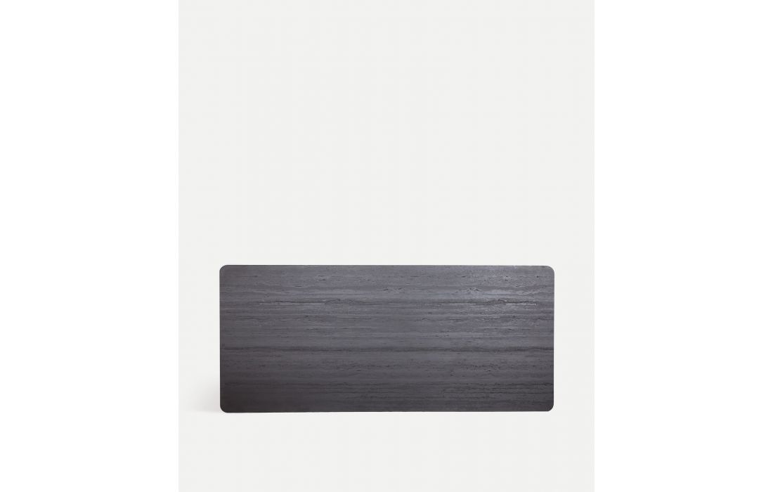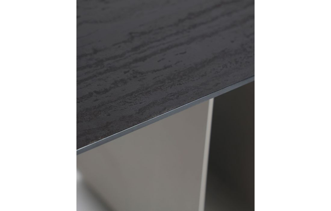 Esta mesa de jantar é definida pelo seu projeto arquitetônico e sua presença visual marcante. Feita em MDF em marrom, combinado com melamina cinza e ferro, cria um contraste equilibrado entre os materiais.