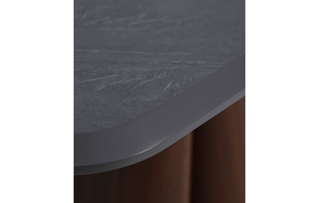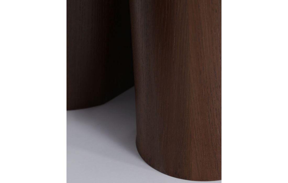 Esta mesa de jantar destaca-se pela sua presença arquitetónica e pela sua base escultórica, concebida para se tornar o eixo do espaço. Feito em MDF em tom marrom, combinado com melamina e contraplacado, fornece força visual.