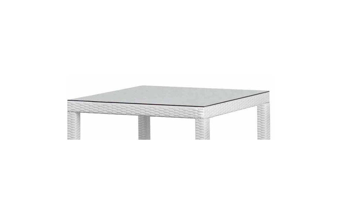 Mesa fixa com estrutura em vime sintético branco e tampo de vidro cinza, retangular ou quadrada.Dimensões em cm C 90 P 90 A 76(quadrada)C 150 P 90 A 76(retangular)Prazo de Entrega30 a 40 dias