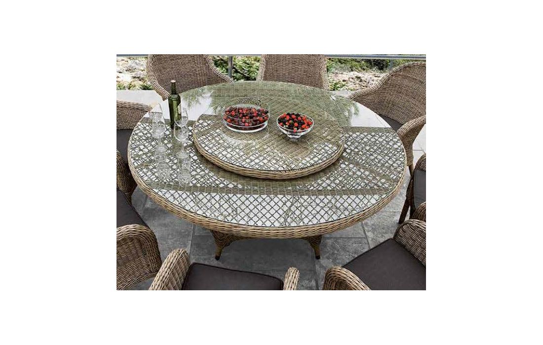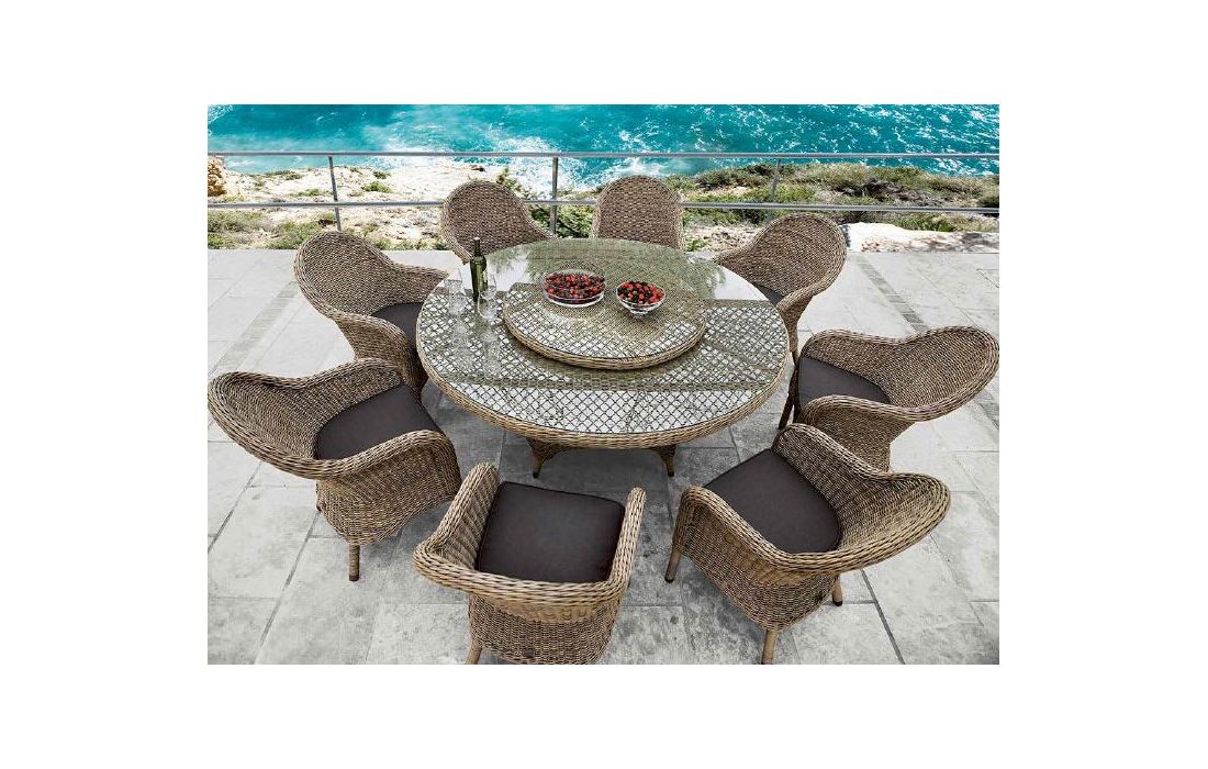 Especificações do Produto Rattan e vidro Tampo de mesa c/ diâmetro de 170 cm Suplemento de mesa giratório c/ diâmetro de 93cm e altura 7cm Não fazemos qualquer alteração ao produto Manutenção e Limpeza Limpar com um pano seco Para tirar manchas deve usar um pano húmido e de seguida passar um pano seco Legenda de medidas (D) Diâmetro(A) Altura