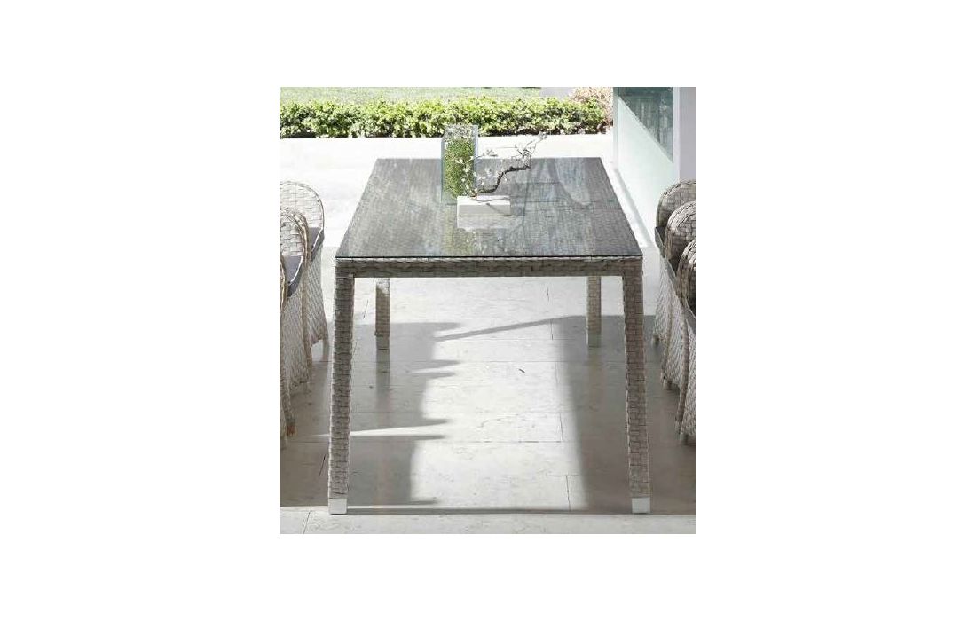 Mesa retangular em rattan com tampo em vidro, para uso exterior.