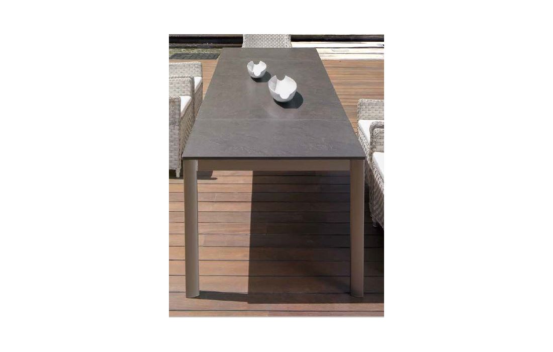Mesa extensível com estrutura em alumínio cinzento antracite e tampo de vidro translúcido, quadrada ou retangular.Dimensões em cm C 90/180 P 90 A 77(quadrada)C 135/270 P 90 A 77(retangular)Prazo de Entrega30 a 40 dias