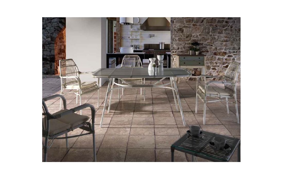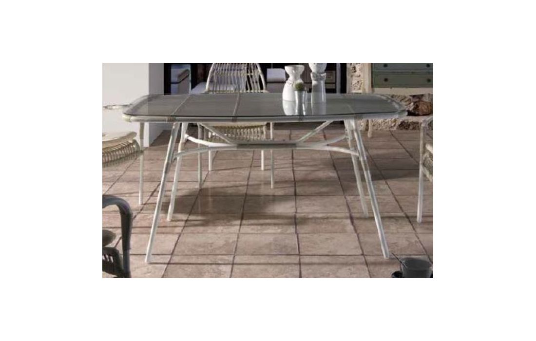 Mesa retangular em rattan com tampo de vidro.