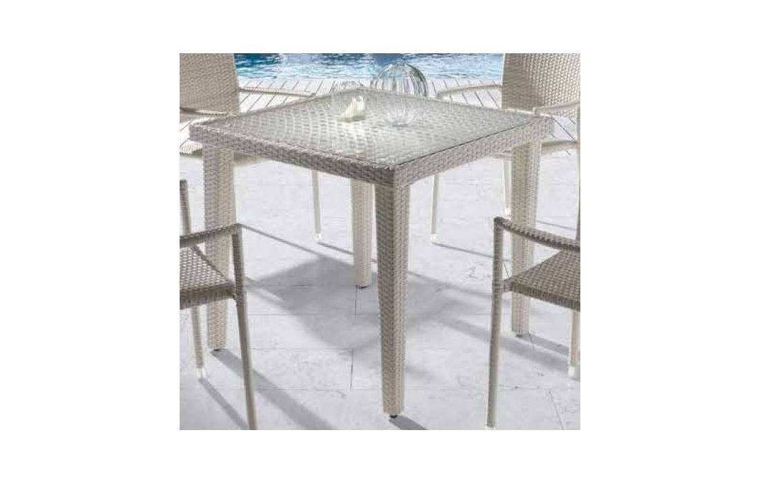 Mesa com estrutura e base em alumínio, revestido em vime castanho ou branco com tampo quadrado em vidro.Dimensões em cmC 80 P 80 A 75Prazo de Entrega15 a 20 dias