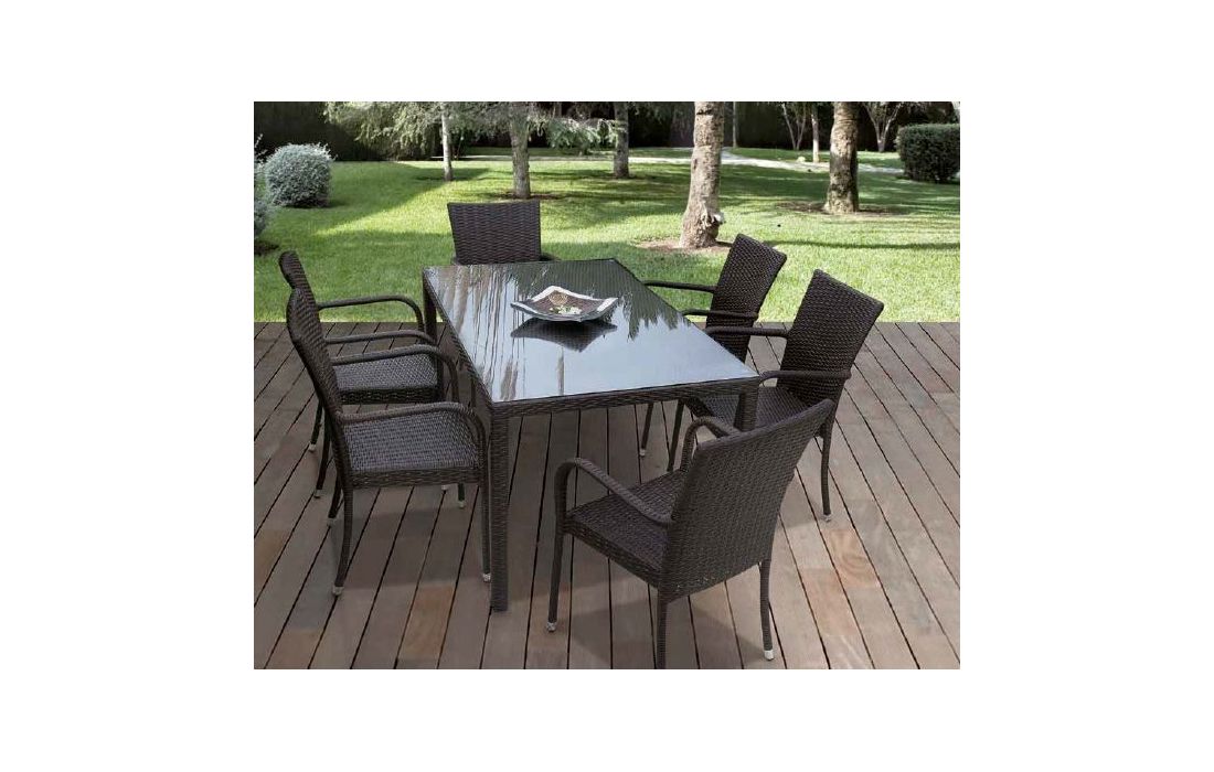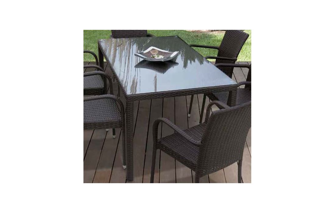 Mesa em rattan castanho com tampo em vidro, para uso exterior.