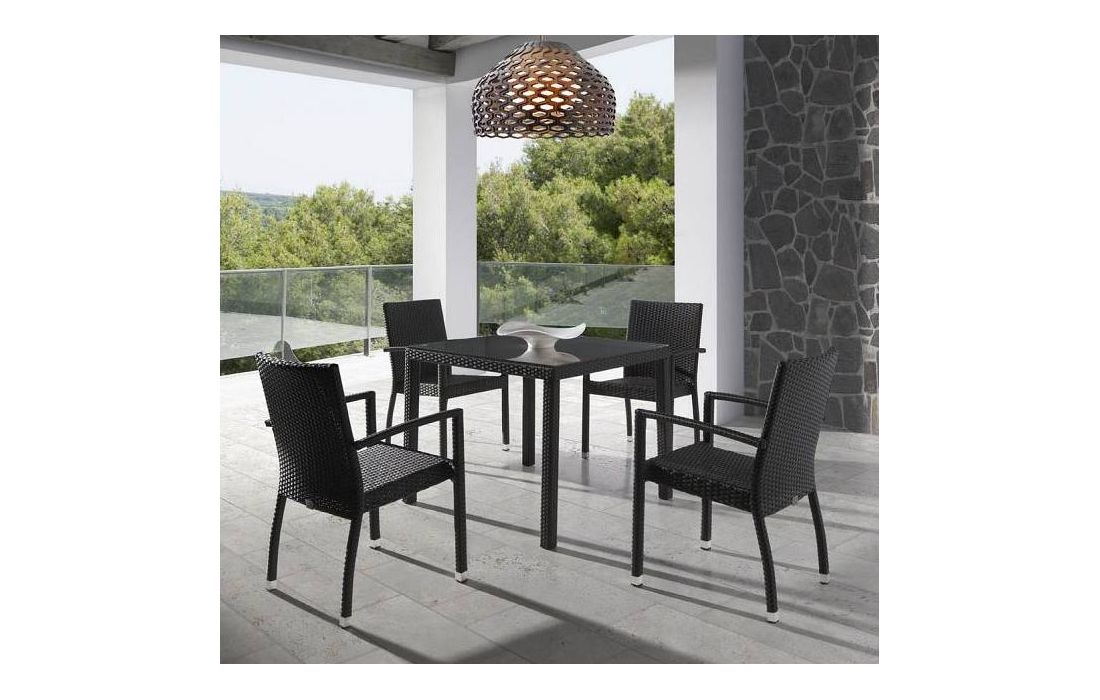 Mesa quadrada em rattan com tampo em vidro, para uso exterior.