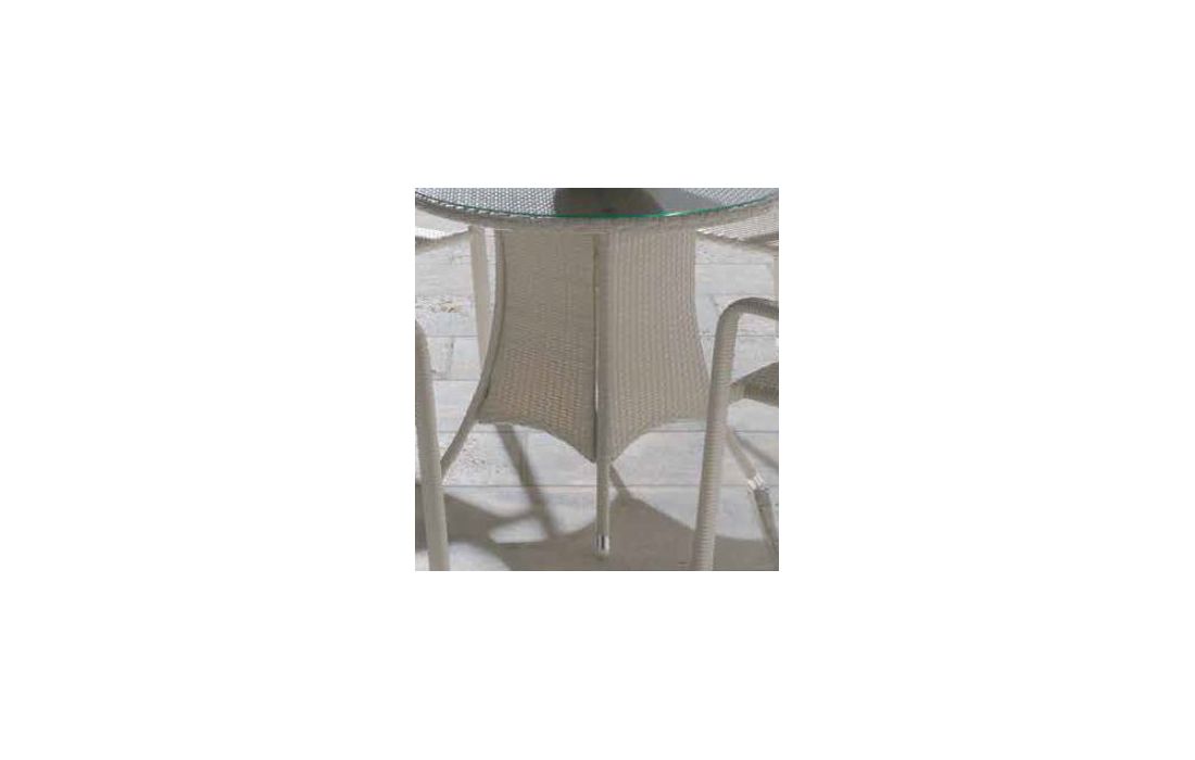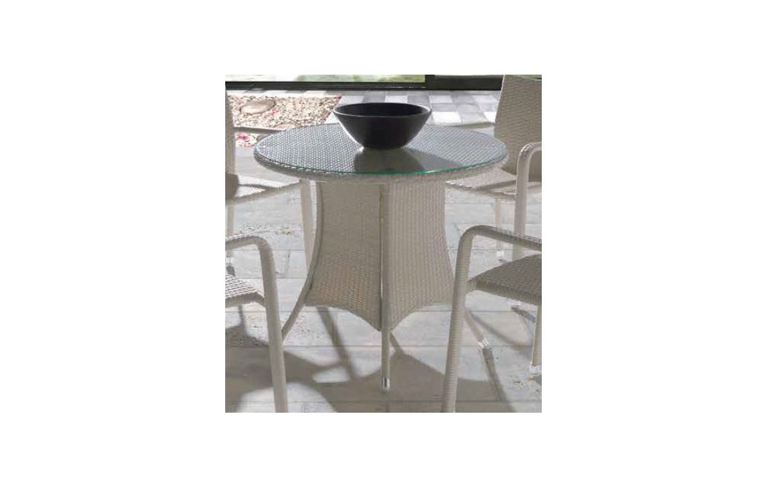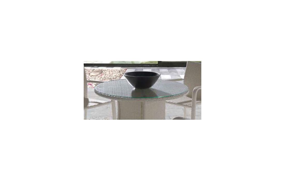 Mesa em rattan com tampo em vidro, para uso exterior.