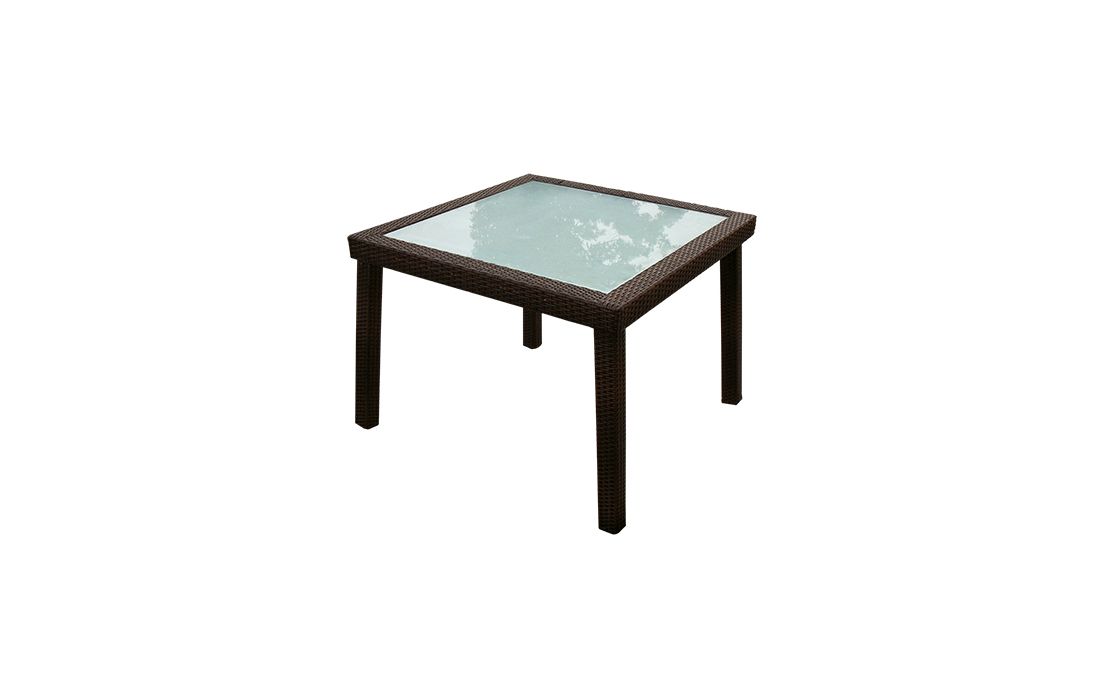 Mesa fixa com estrutura em vime sintético castanho escuro e tampo de vidro translúcido, retangular ou quadrada.Destinatário :