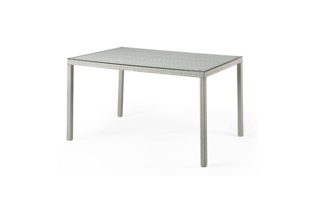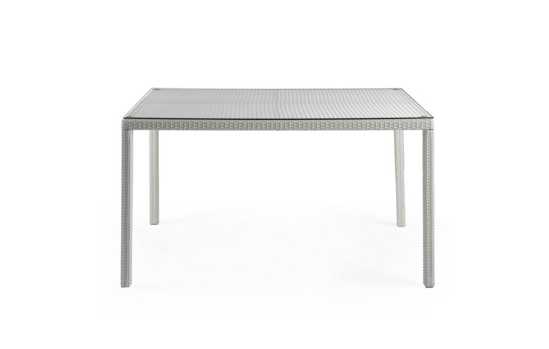 Mesa fixa com estrutura em vime sintético branco e tampo de vidro cinza, retangular ou quadrada.Dimensões em cm C 90 P 90 A 76(quadrada)C 150 P 90 A 76(retangular)Prazo de Entrega30 a 40 dias