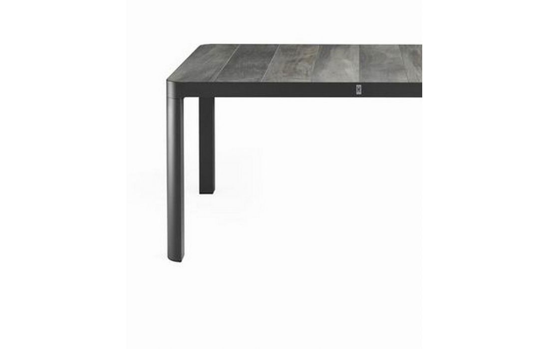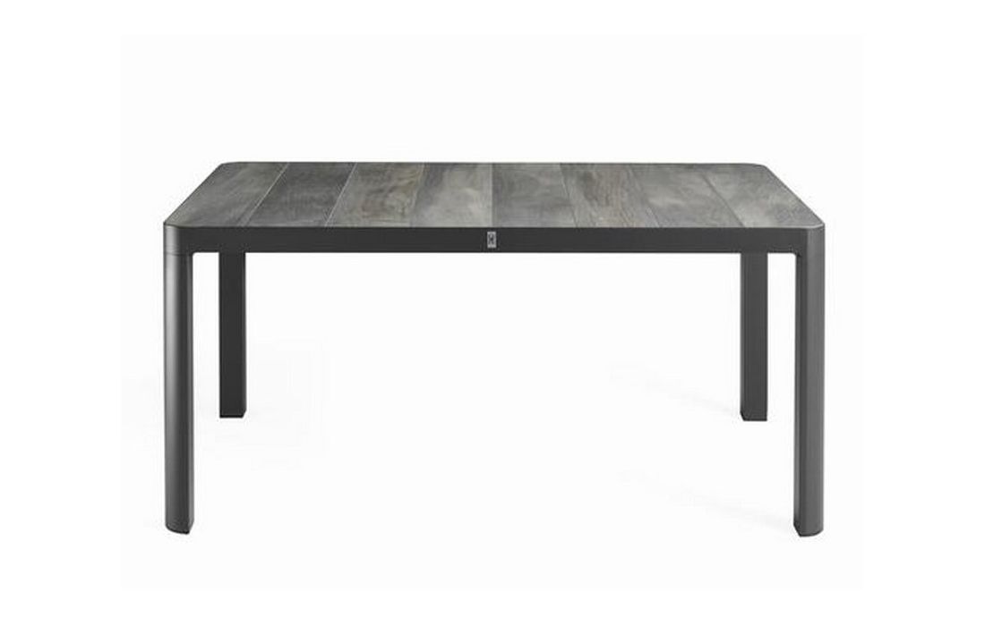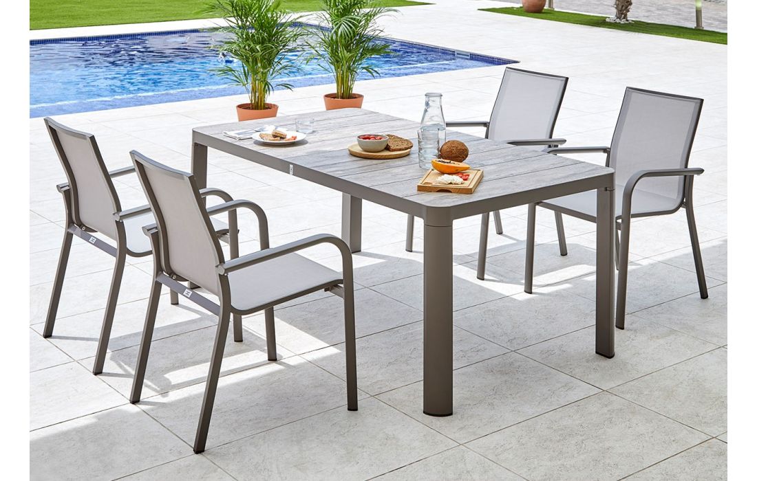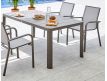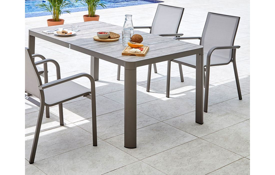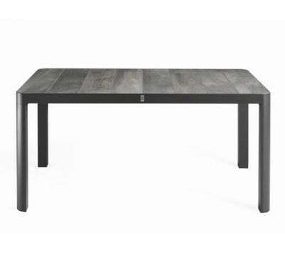 Mesa retangular em aluminio com tampo em ceramica, para uso exterior.