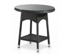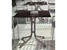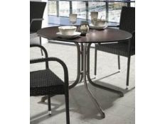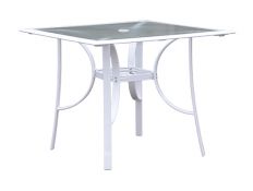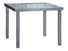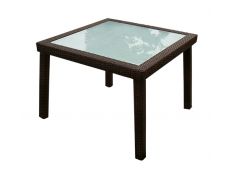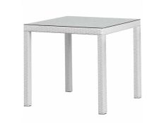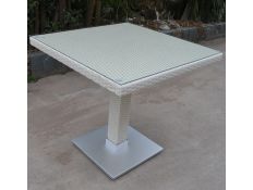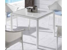 Mesa com estrutura e base em alumínio, revestido em vime castanho ou branco com tampo quadrado em vidro.Dimensões em cmC 80 P 80 A 75Prazo de Entrega15 a 20 dias