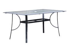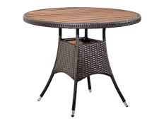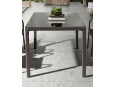 Mesa fixa com estrutura em vime sintético castanho escuro e tampo de vidro translúcido, retangular ou quadrada.Dimensões em cm C 90 P 90 A 76(quadrada)C 150 P 90 A 76(retangular)Prazo de Entrega30 a 40 dias