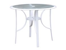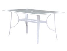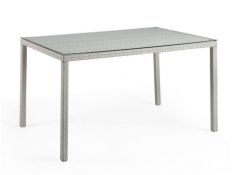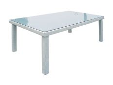 Mesa fixa com estrutura em vime sintético branco e tampo de vidro cinza, retangular ou quadrada.Dimensões em cm C 90 P 90 A 76(quadrada)C 150 P 90 A 76(retangular)Prazo de Entrega30 a 40 dias