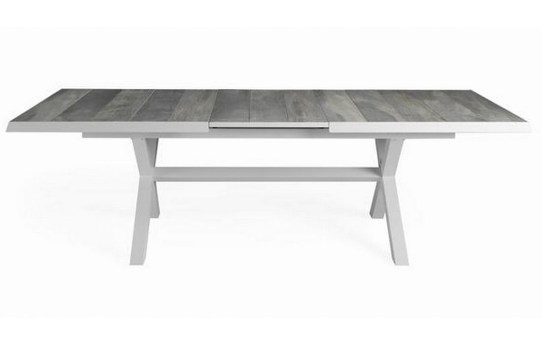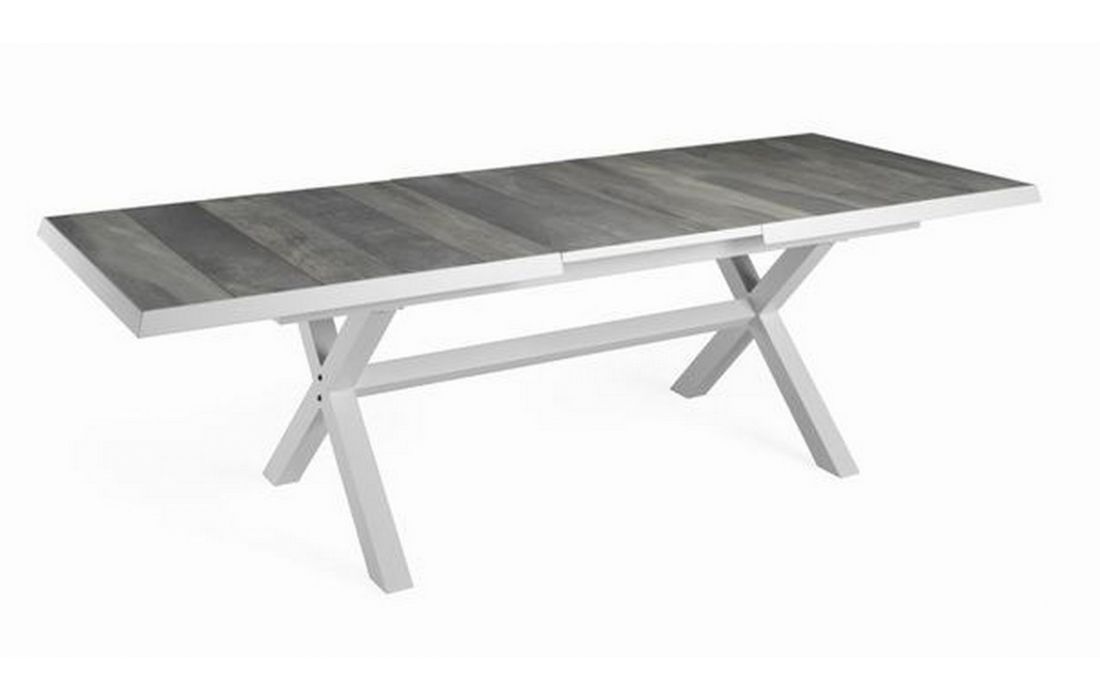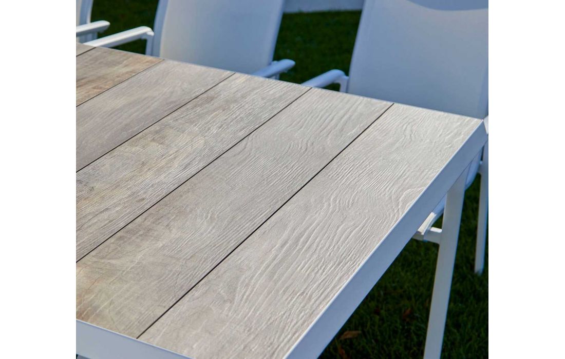 Mesa retangular em aluminio com tampo em ceramica, para uso exterior.