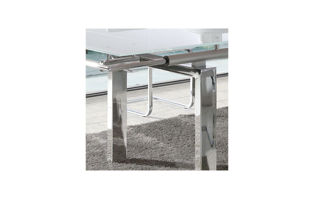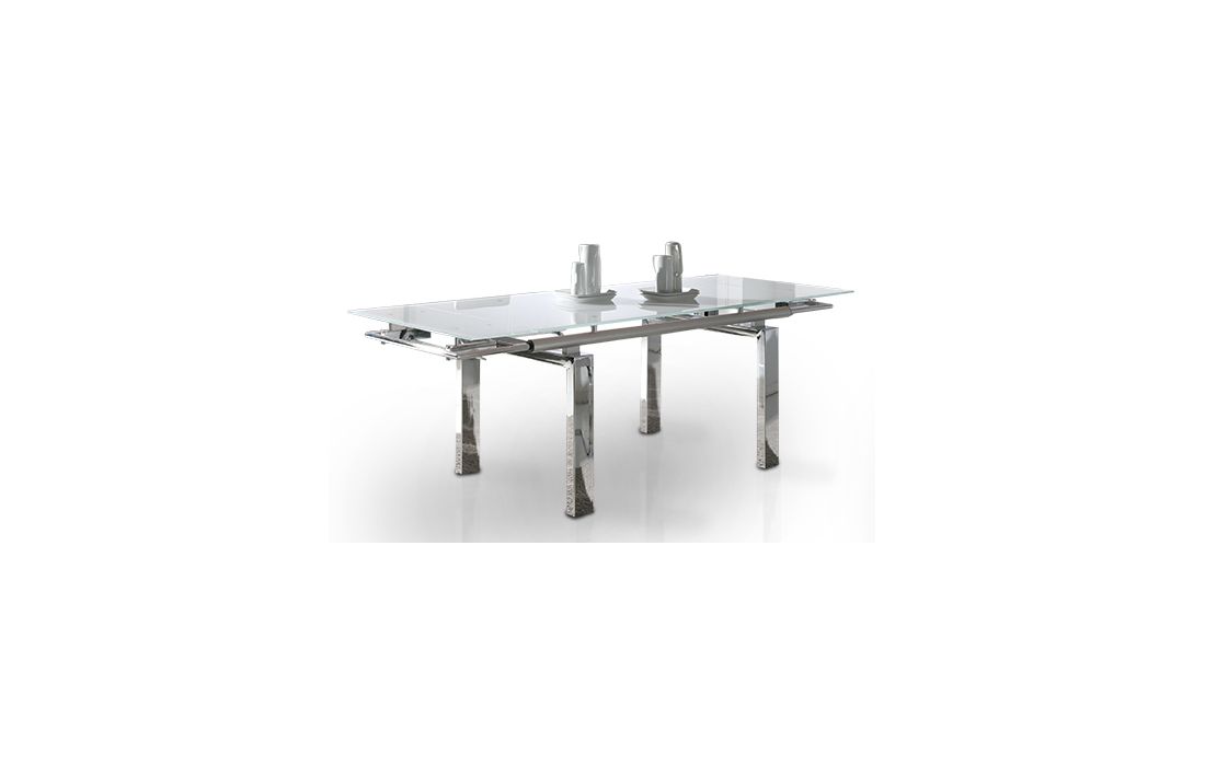 Mesa extensível com tampo de vidro branco puro e estrutura em metal cromado