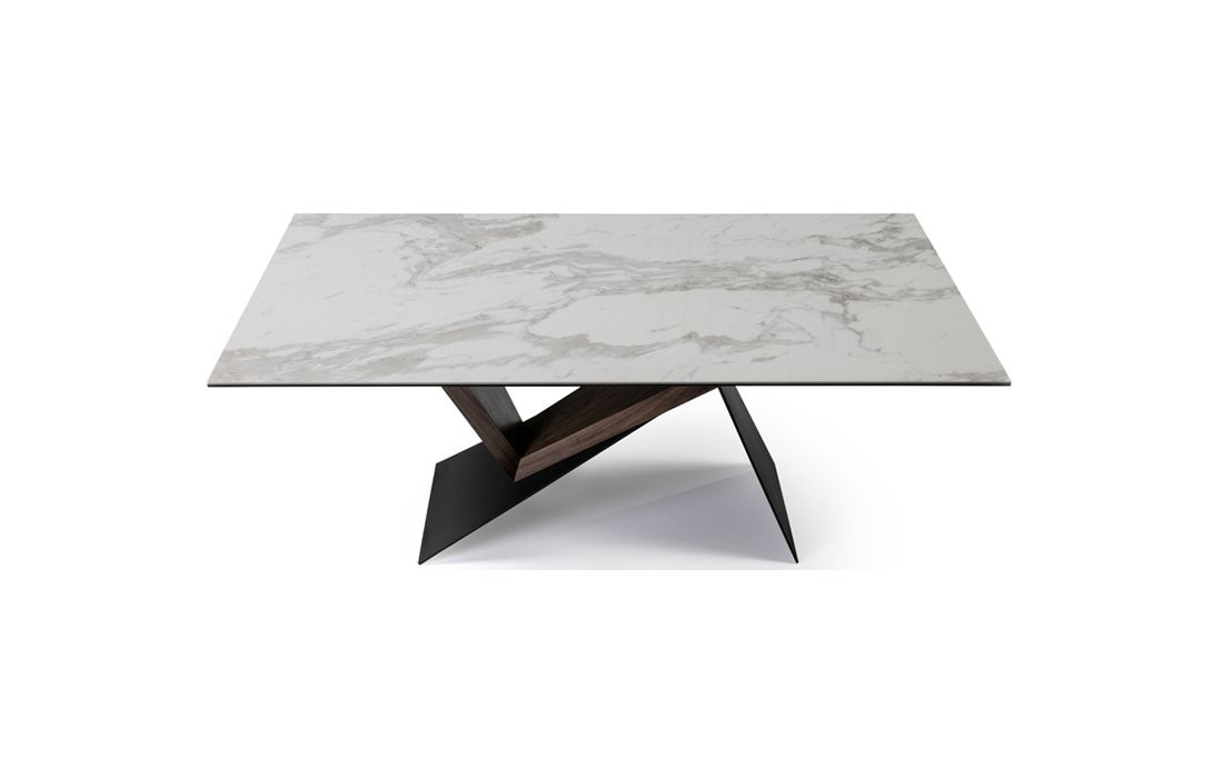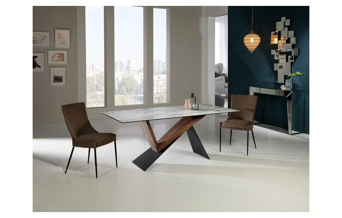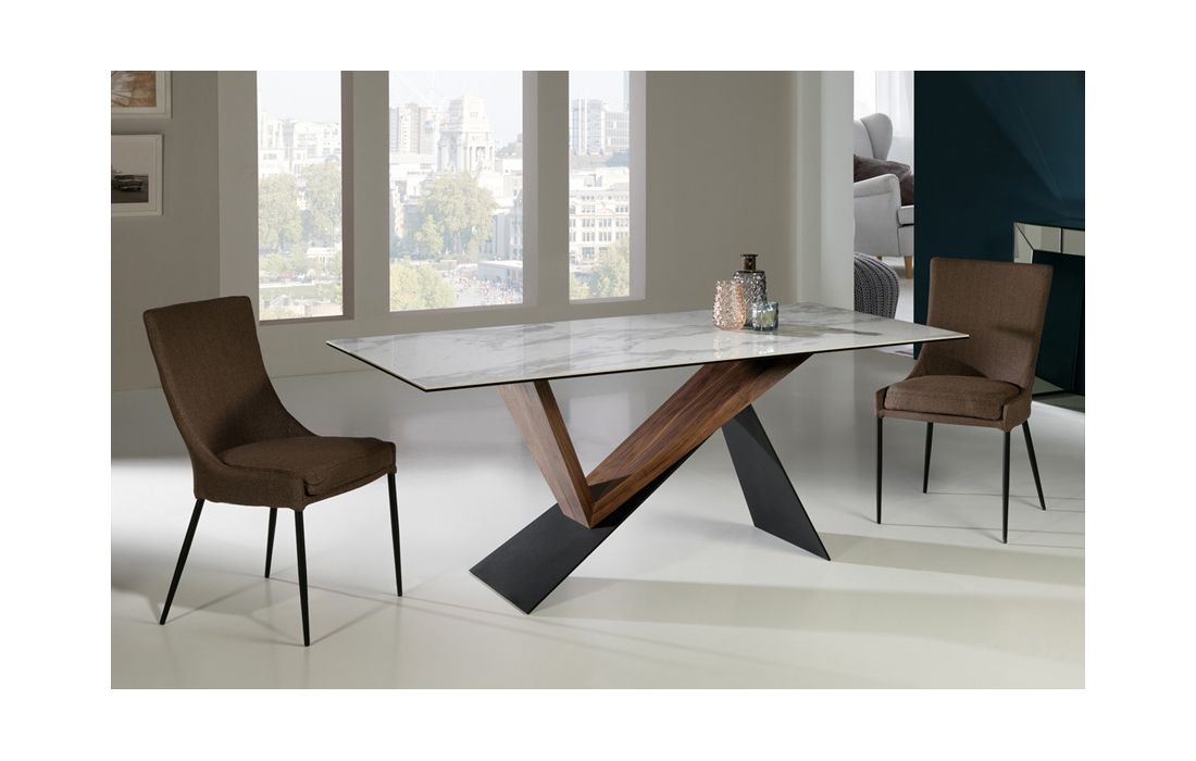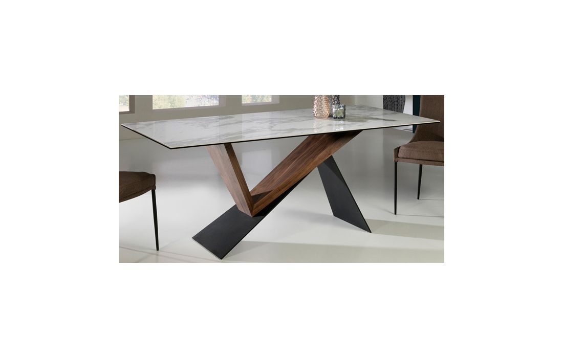 Mesa de sala de jantar em metal, lacado em preto mate, e madeira de nogueira. Tampo laminado de porcelânico e vidro, com decoração mármore branco.
