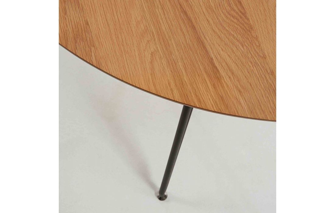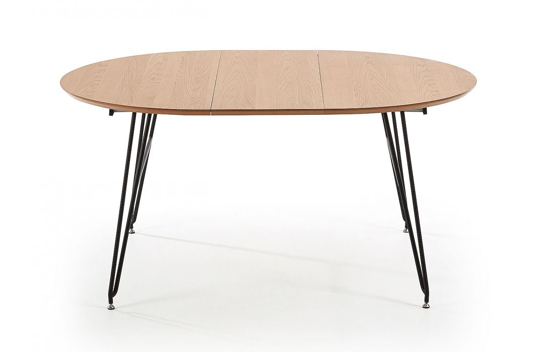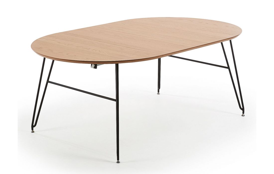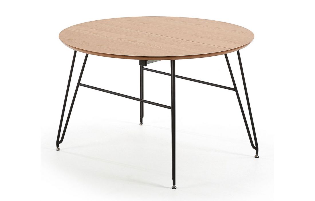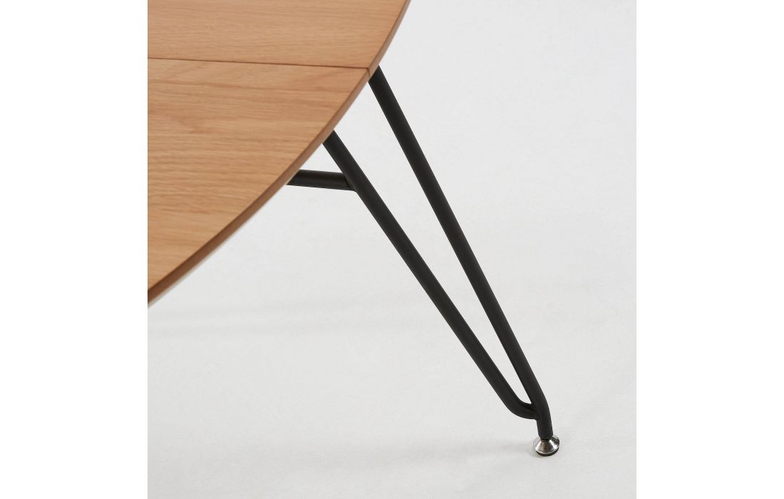 Mesa de jantar redonda extensível com tampo folheado em carvalho cor natural e estrura em metal preto com duas extensões de 40 cm cada, medida da mesa fechada è de 120 cm e aberta 200 cm.