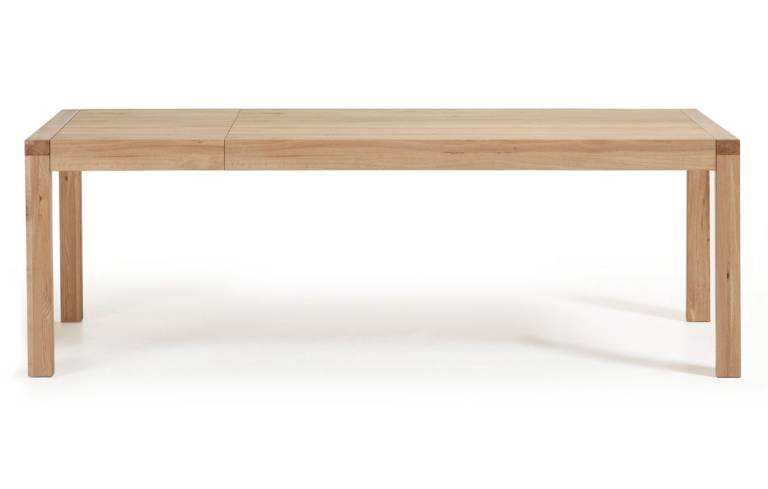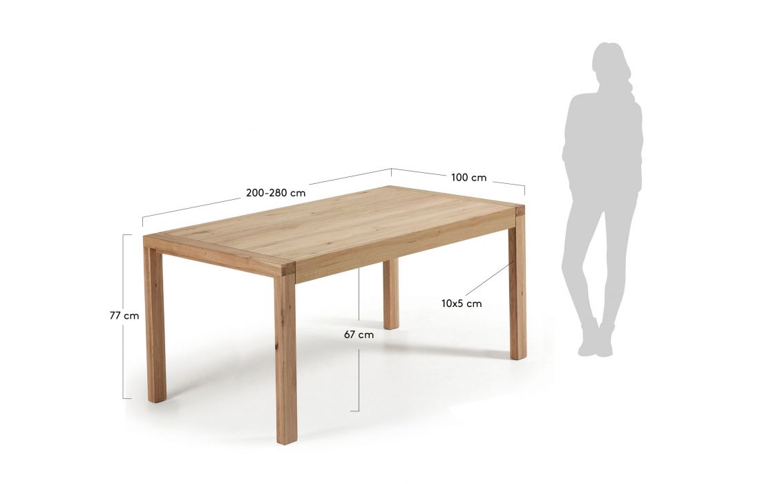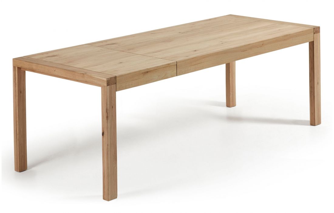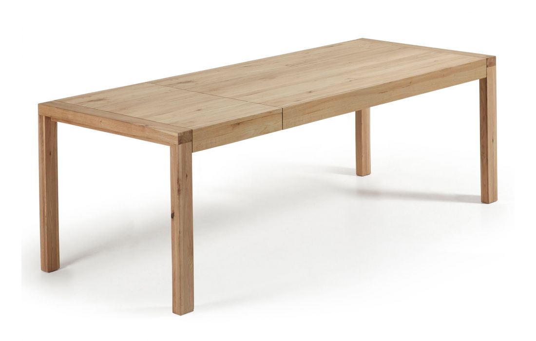 Mesa de jantar extensível em madeira de carvalho com acabamento natural. Disponivel com duas medidas de 180 (230) com uma extensão de 50 cm ou de 200 (280) com uma extensão de 80 cm.