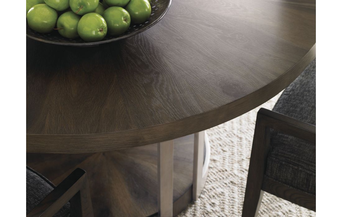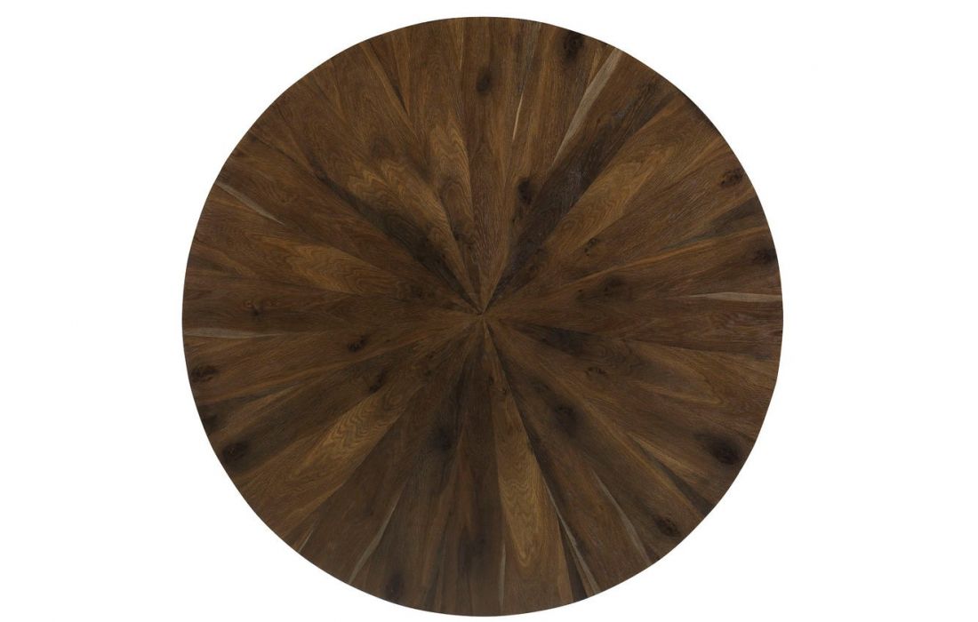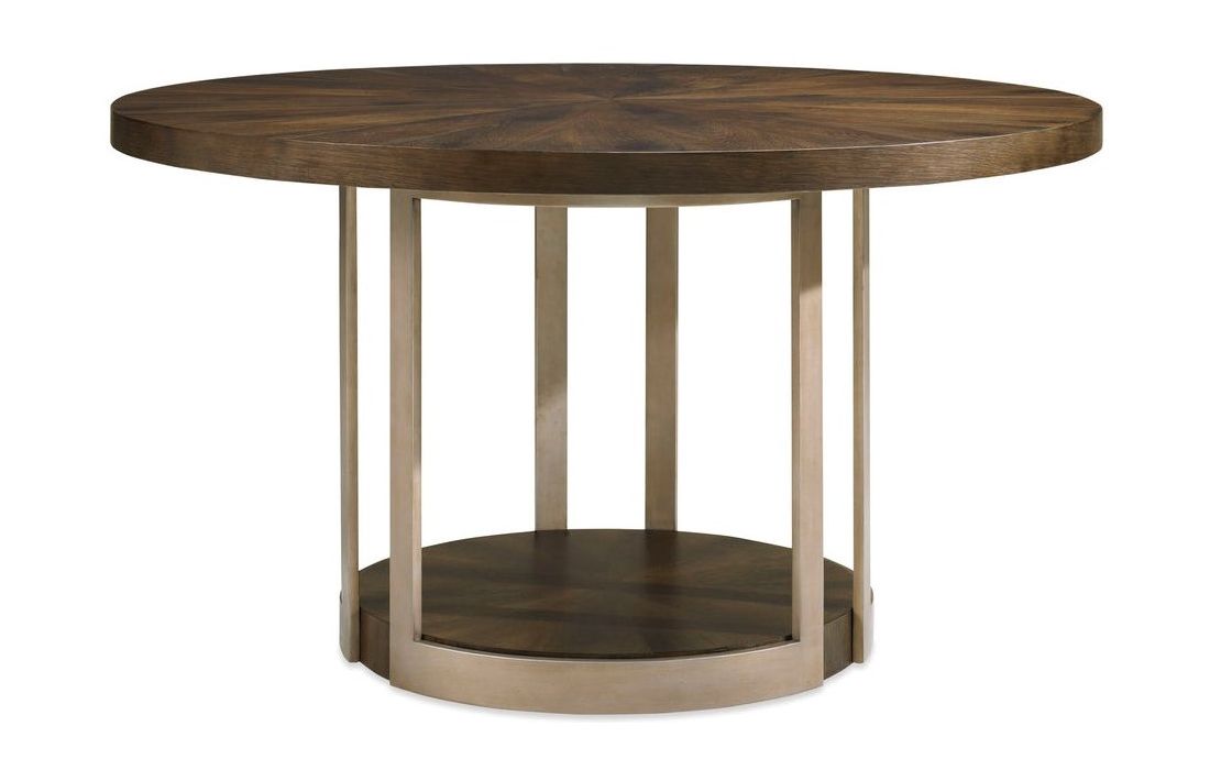 Mesa de jantar redonda com tampo em carvalho e estrutura em metal dourado