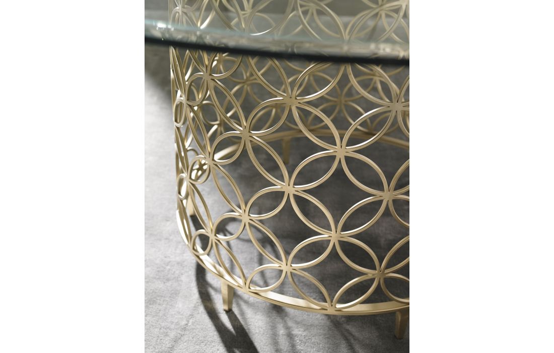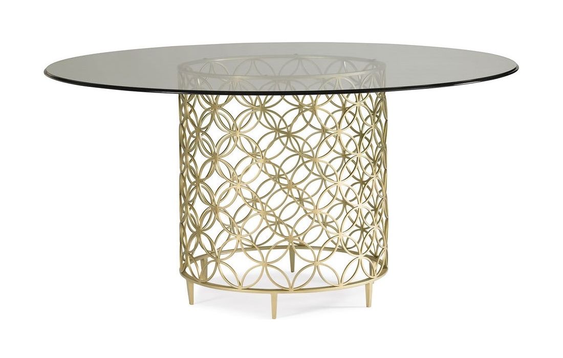 Mesa de jantar redonda com tampo em vidro e pormenores em folha de ouro