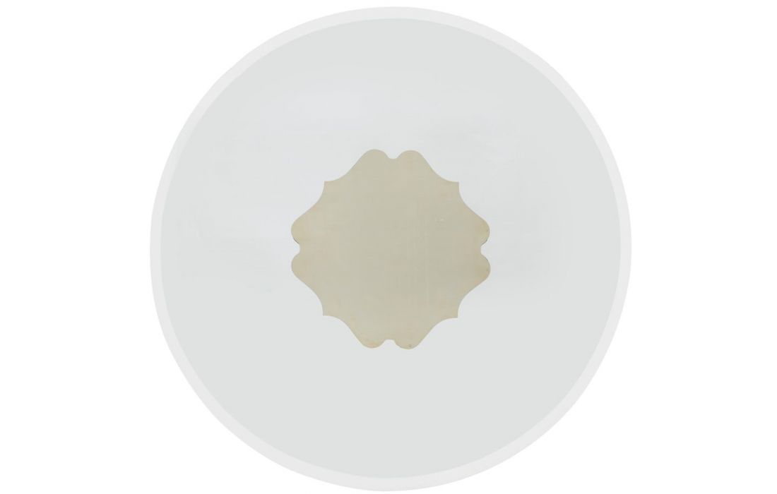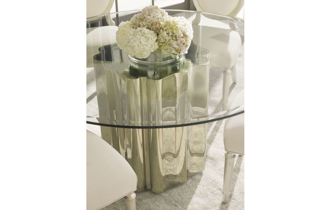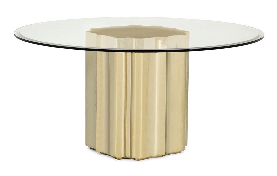 Mesa de jantar redonda com tampo em vidro e estrutura em metal dourado